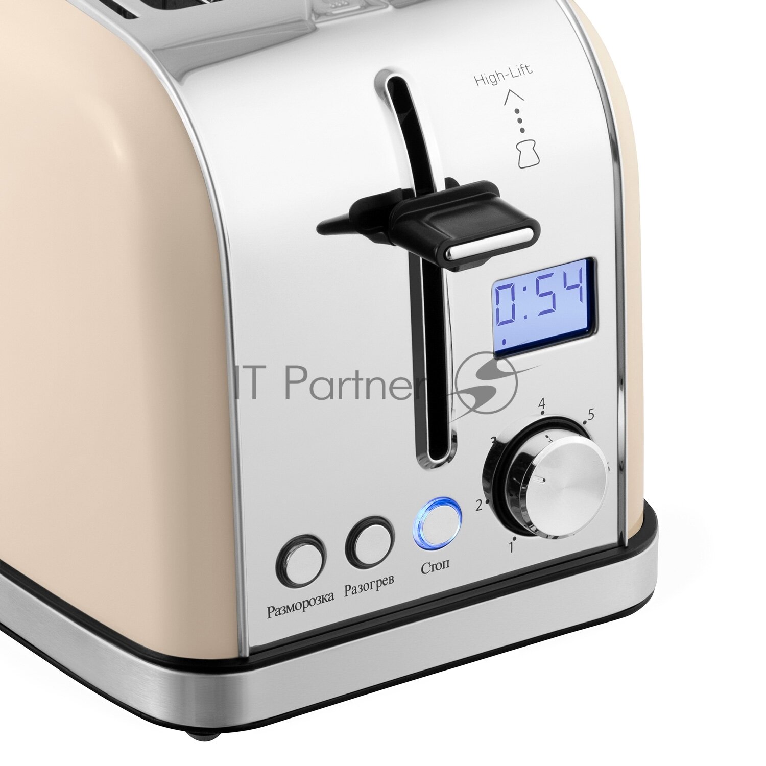 Элегантный тостер, выполненный из нержавеющей стали. Автоцентрирование - для равномерной обжарки с обеих сторон тостов любой толщины. Выбор одного из 3 режимов работы происходит с использованием кнопок с LED подсветкой. Степень обжаривания отображается черточками на экране. Также на дисплее показывается обратный отсчет времени приготовления. Функция Разморозки - для использования замороженного хлеба для готовки. Функция Разогрева - для подогрева остывших тостов. В нижней части тостера расположен съёмный поддон для сбора крошек.