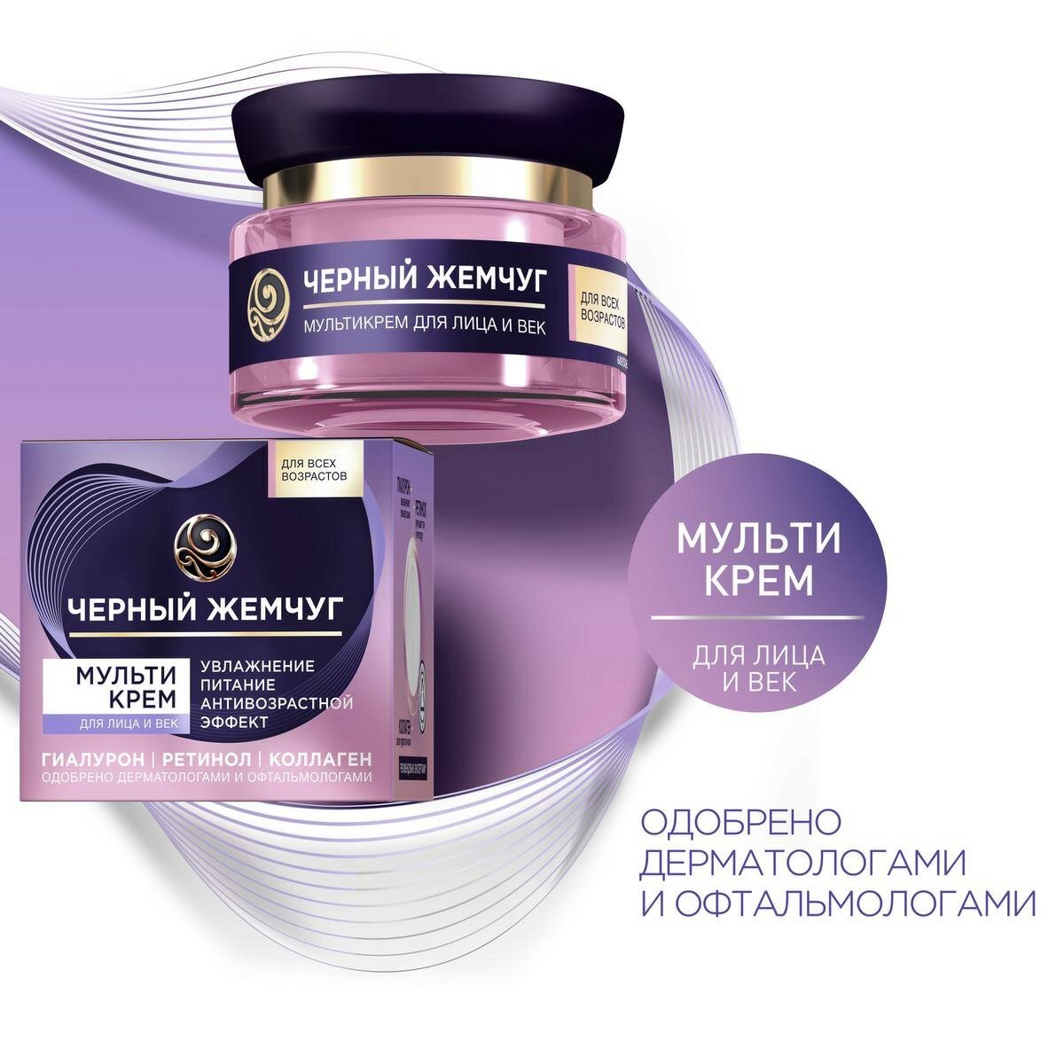 С мультикремом от бренда Черный Жемчуг комплексная забота за кожей лица, шеи и кожи вокруг глаз ? это легко! Продукт разработан с учетом?потребностей разных возрастных категорий. Подходит как для дневного, так и для ночного применения. Содержит более 17 компонентов для красоты кожи. Чистый гиалурон восстанавливает водный баланс кожи и поддерживает необходимый уровень увлажнения. Ретинол улучшает тон и текстуру кожи и ускоряет процесс обновления. Активно воздействует на мимические морщинки. Коллаген подтягивает кожу, повышает упругость и эластичность. Мультикрем имеет более 11 доказанных эффектов: выравнивает рельеф, придает здоровое сияние, увлажняет, оказывает антивозрастное воздействие, интенсивно питает без жирного блеска, успокаивает кожу'', устраняет сухость, тонизирует, обеспечивает антиоксидантное действие, улучшает тон, быстро впитывается, укрепляет кожу и прекрасно освежает. [''] клинически доказано независимым институтом, РФ, 2021.