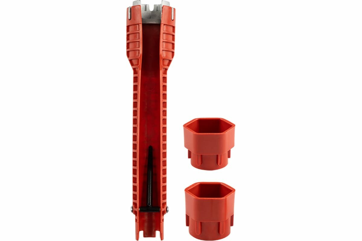 Универсальный многофункциональный ключ предназначен для монтажа и демонтажа смесителей, водонагревателей, раковин, унитазов. Удлиненная конструкция облегчает работу в труднодоступных местах с крепежными гайками на смесителях, распылителях и шаровых кранах. В комплект входит противоскользящий ключ, насадка 21 мм, 23мм, 27мм, головка 34мм, 40мм, экстрактор (сверло) для извлечения сломанных болтов, подводок.