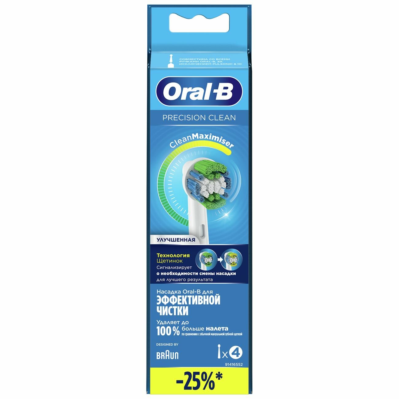 Насадки Oral-B Precision Clean средней жесткости предназначены для ежедневной чистки зубов. Скругленная форма щетины обеспечивает удаление налёта со всех сторон зуба и массаж вдоль линии десны. Зеленые щетинки-индикаторы CleanMaximiser меняют цвет на желтый, напоминая о необходимости замены насадки.Насадка Precision Clean совместима со всеми электрическим зубным щеткам Oral-B, кроме Oral-B Sonic/Pulsonic и iO.В комплект входят 4 насадки в герметичной индивидуальной упаковке. Стоматологи рекомендуют менять насадки не реже, чем раз в 3 месяца.Производитель на свое усмотрение и без дополнительных уведомлений может менять комплектацию, внешний вид упаковки, страну производства и характеристики продукта. Проверяйте в момент получения товара.
