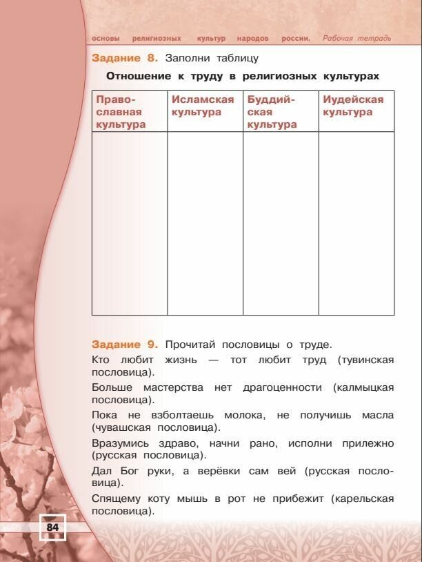 Рабочая тетрадь включает творческие и проверочные задания, а также исследовательские задания и проекты (индивидуальные и коллективные). Тетрадь поможет четвероклассникам закрепить и углубить знания об основах религиозных культур, развить творческое мышление, отработать универсальные учебные действия, сформировать представления о нравственном поведении, о тех правилах и нормах, на которых должны строиться взаимоотношения с людьми.