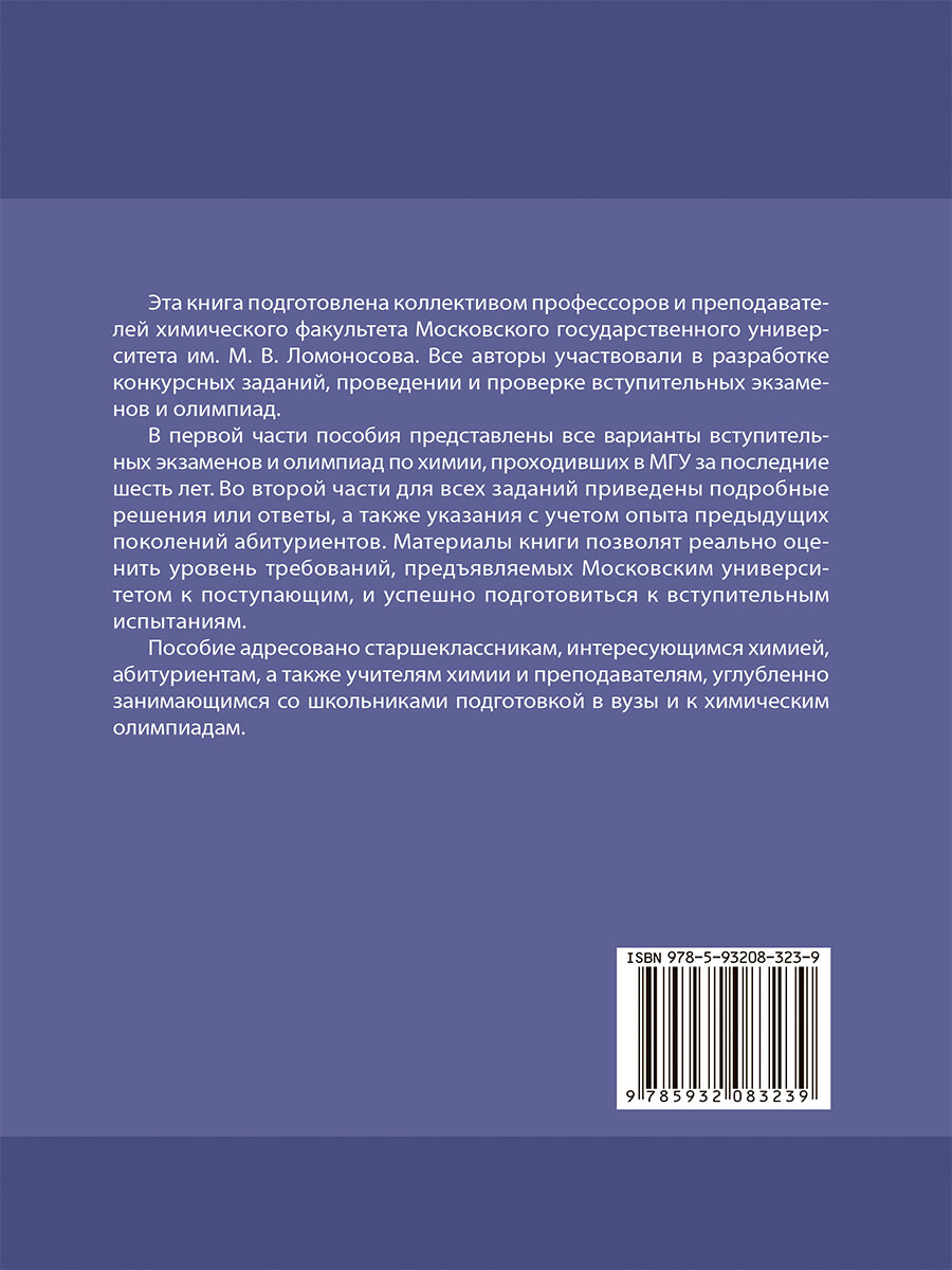 В этом пособии крупнейший отечественный вуз — Московский государственный университет имени М. В. Ломоносова — представляет все варианты экзаменационных и олимпиадных заданий по химии, предлагавшиеся на университетских олимпиадах и вступительных экзаменах на факультетах МГУ в период за 2017–2022 годы. Для каждого варианта приведены подробные решения заданий или же ответы и указания к решению. При разборе задач учтен опыт и замечания предыдущих поколений абитуриентов и конкурсантов. Пособие предназначено для абитуриентов, поступающих в вузы на химические, медицинские и биологические специальности, а также для школьников старших классов и учителей химии.