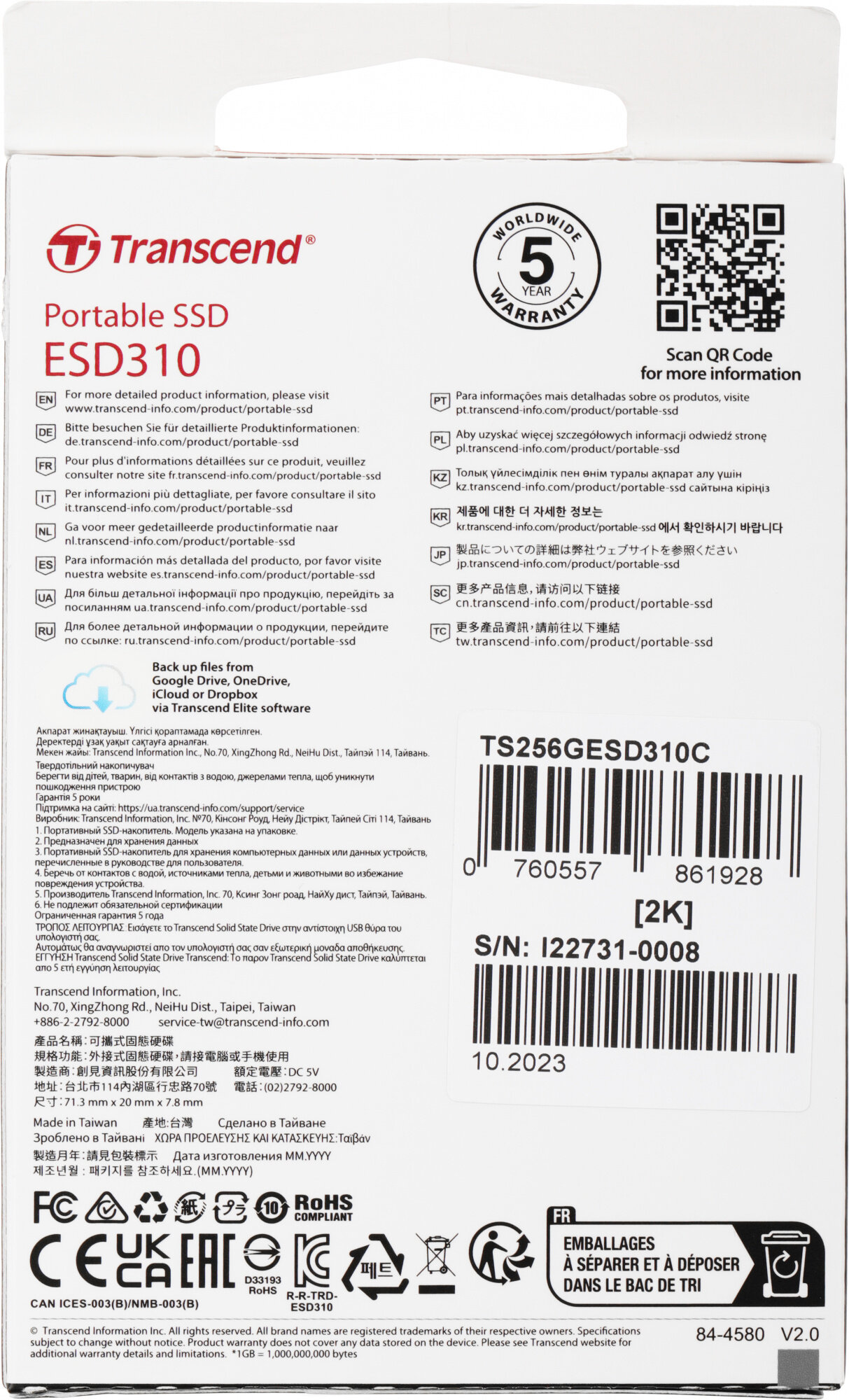 На ESD310C распространяется пятилетняя ограниченная гарантия. Чтобы обеспечить высочайший уровень качества, твердотельные накопители Transcend проходят тщательные испытания на всех этапах производства, включая испытания на вибрацию, температуру и влажность, скорость и функциональность.