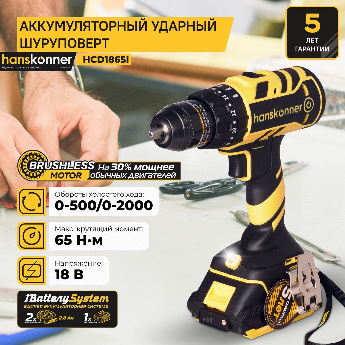 дрель-шуруповерт ударная HANSKONNER 18В Li-Ion 24Ач бесщеточная 2 АКБ HCD1865I