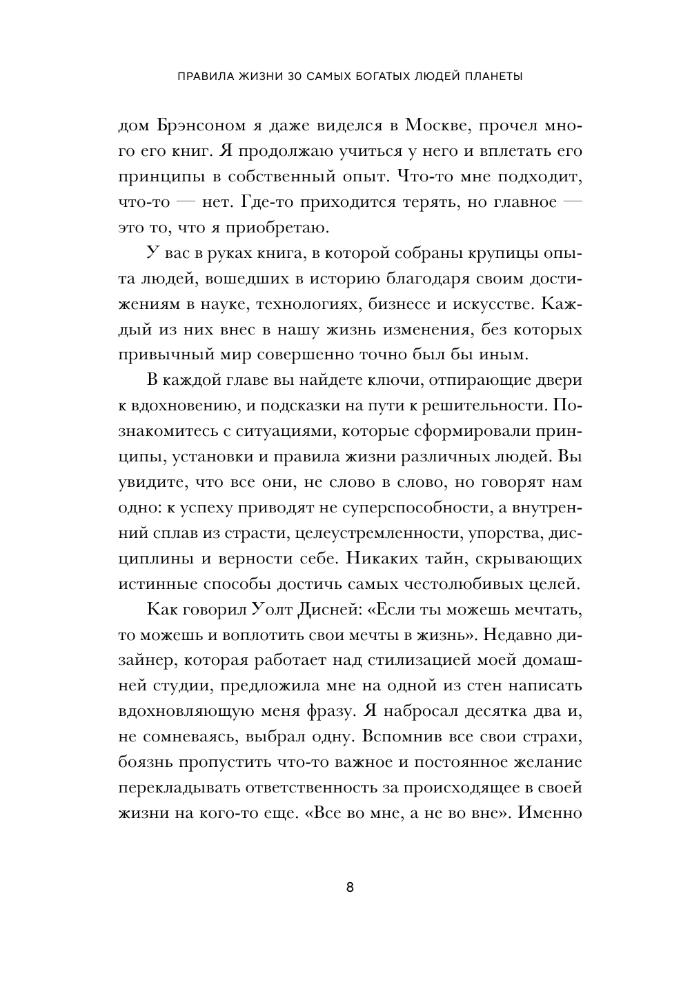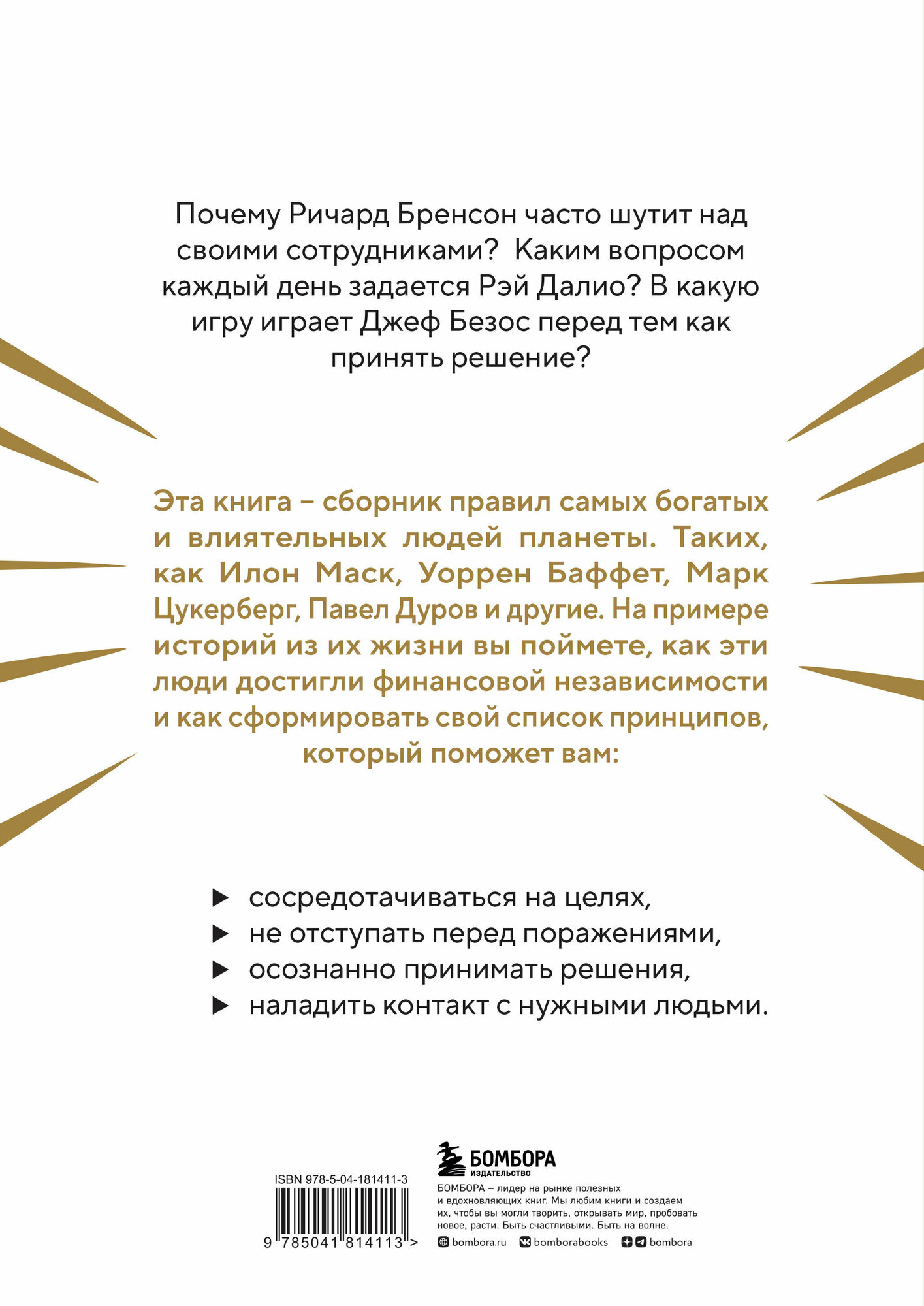 Эта книга – сборник правил самых богатых и влиятельных людей планеты. Таких как Илон Маск, Уоррен Баффет, Марк Цукерберг, Павел Дуров и другие. На примере историй из их жизни вы поймете, как эти люди достигли финансовой независимости и как сформировать свой список принципов, который поможет вам: