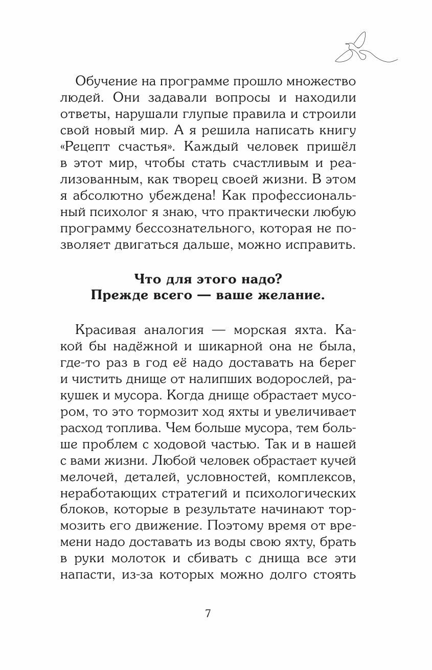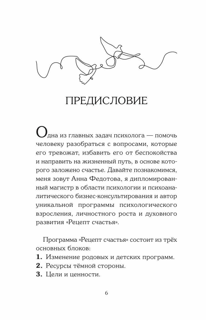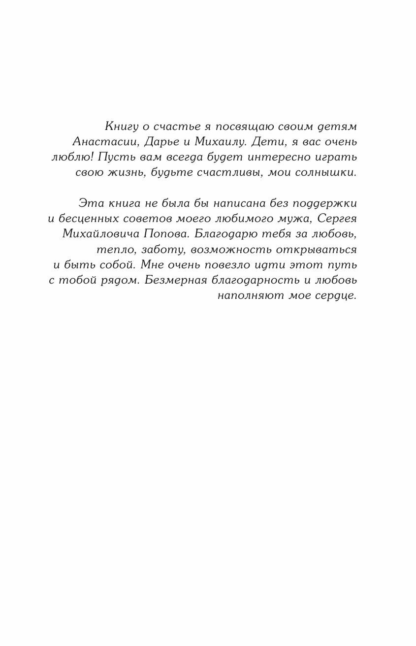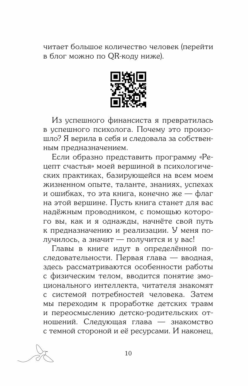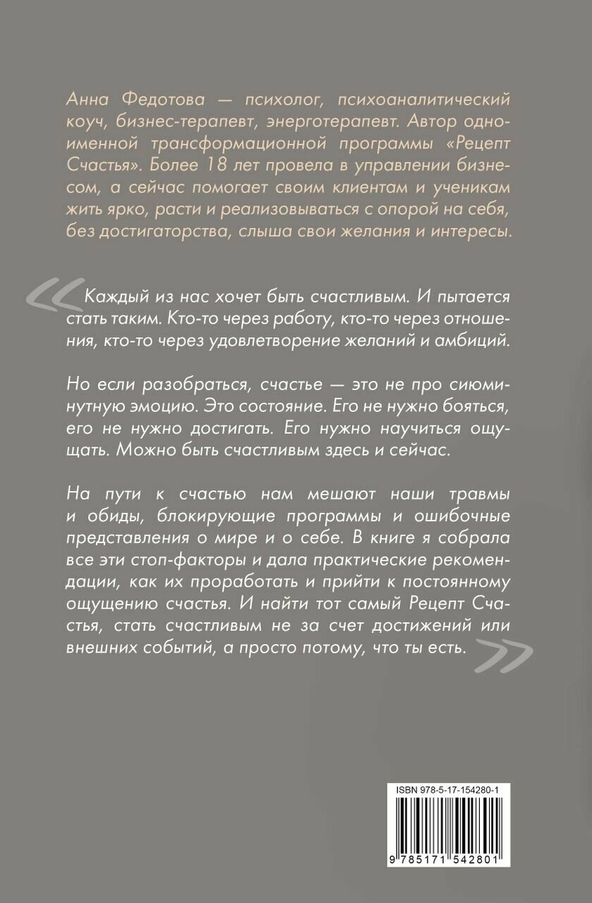 На пути к счастью нам мешают наши травмы и обиды, блокирующие программы и ошибочные представления о мире и о себе. В книге я собрала все эти стоп-факторы и дала практические рекомендации, как их проработать и прийти к постоянному ощущению счастья. И найти тот самый Рецепт Счастья, стать счастливым не за счет достижений или внешних событий, а просто потому что ТЫ ЕСТЬ".