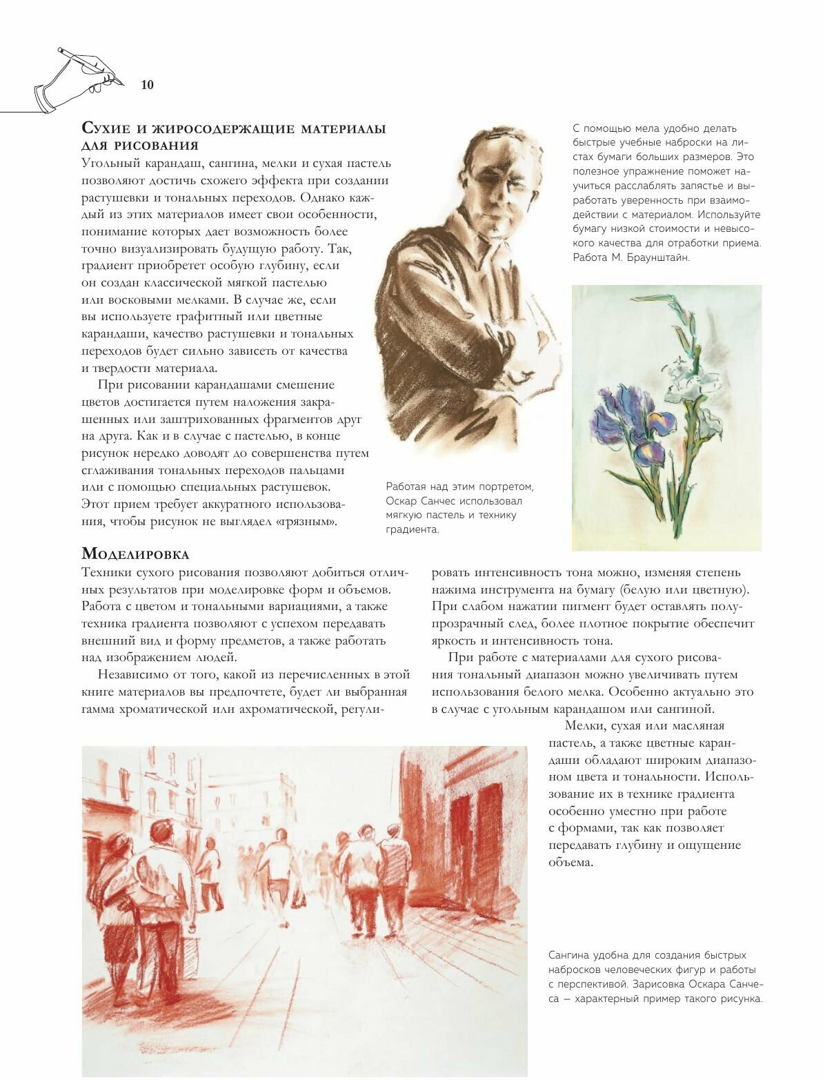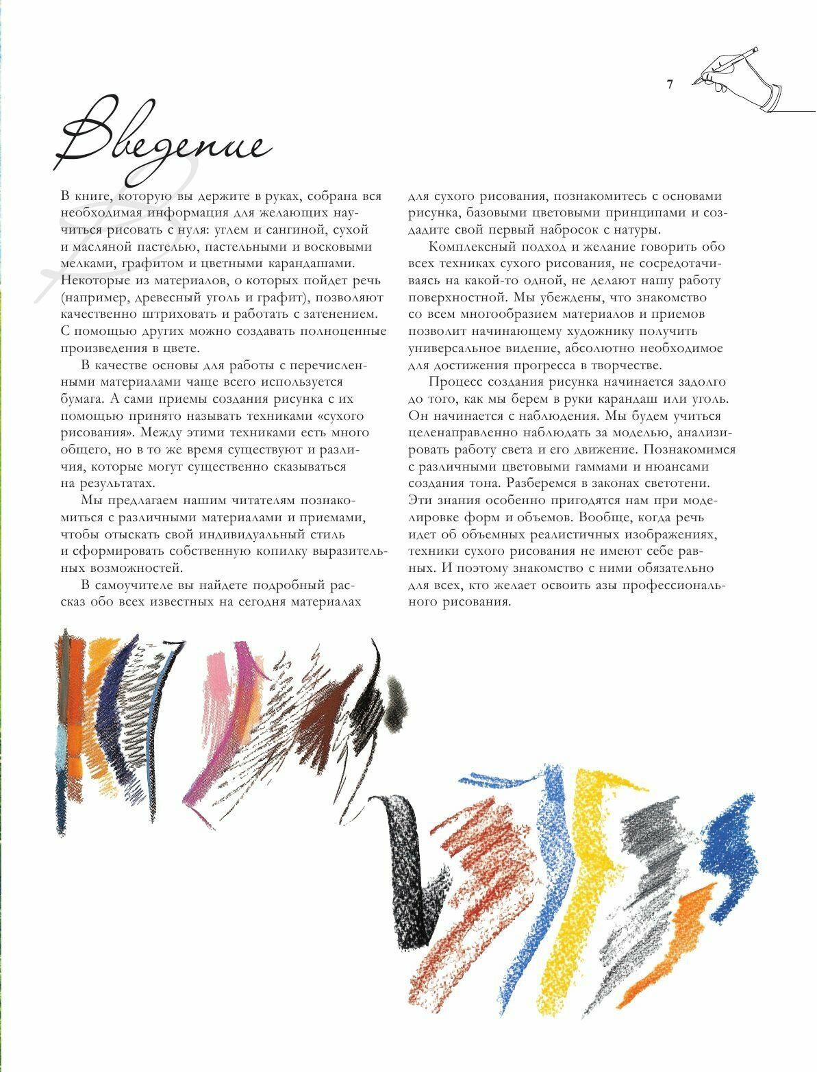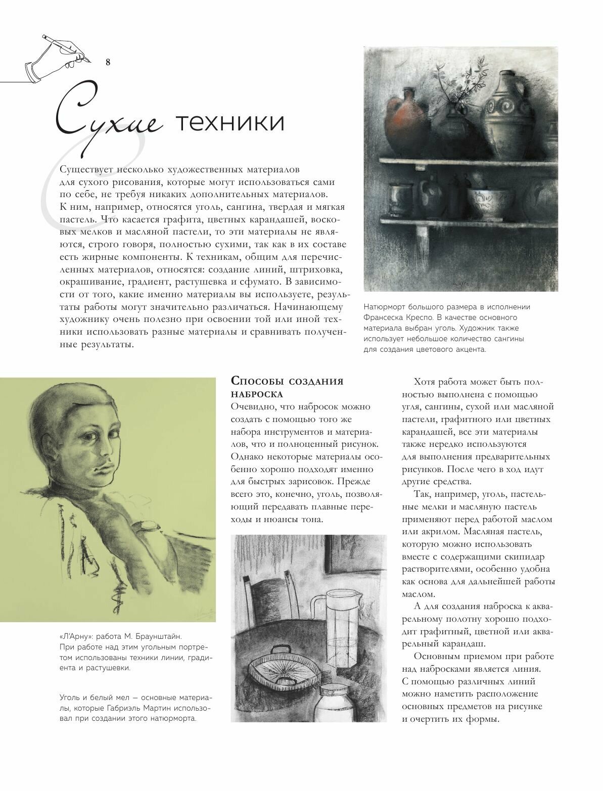 Обожаю подобные издания, из этой книги можно многое узнать о сухой технике рисования, что поможет разнообразить творческий процесс, научиться работе с новыми материалами. Здесь есть пошаговые уроки рисования пастелью, сангиной, углем, карандашами, всё что нужно для графики. Эти техники не требуют больших затрат и подготовки, в них приятно и комфортно работать. А качественные иллюстрации вдохновят на создание собственных шедевров