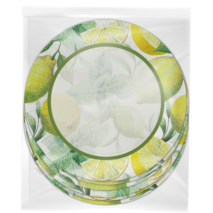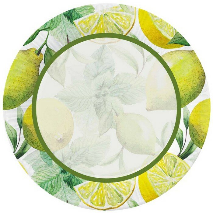 Набор бумажных тарелок «Лимоны» ? стильный элемент в стиле кантри для украшения праздничного стола и пикника. На каждой тарелке изображены яркие изображения лимонов с мятой. Набор для праздника и пикника состоит из 6 бумажных тарелок диаметром 230 мм, упакованных пленку. Тарелки изготовлены из плотного мелованного картона, который не промокнет во время праздника. Необычный дизайн тарелок с легкостью поднимет настроение гостям и поможет создать праздничную атмосферу. Одноразовая посуда – простое и стильное украшение для любого события.