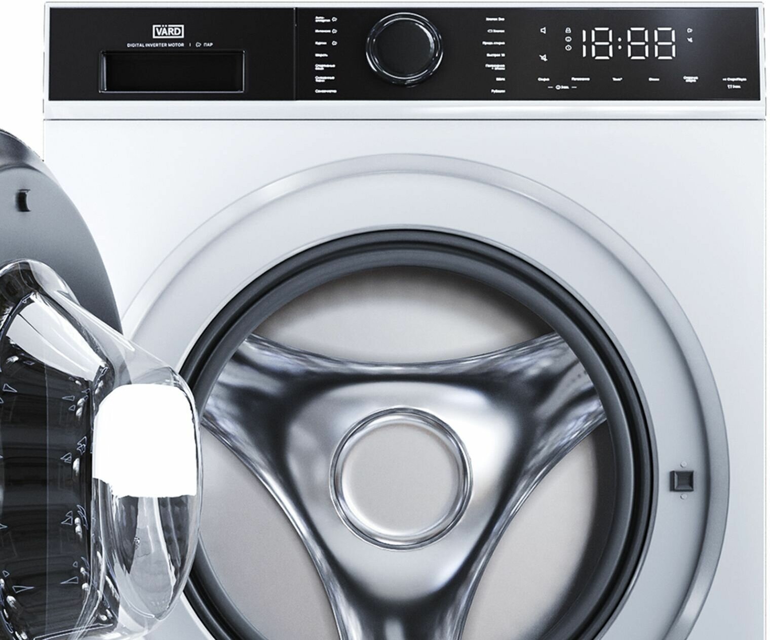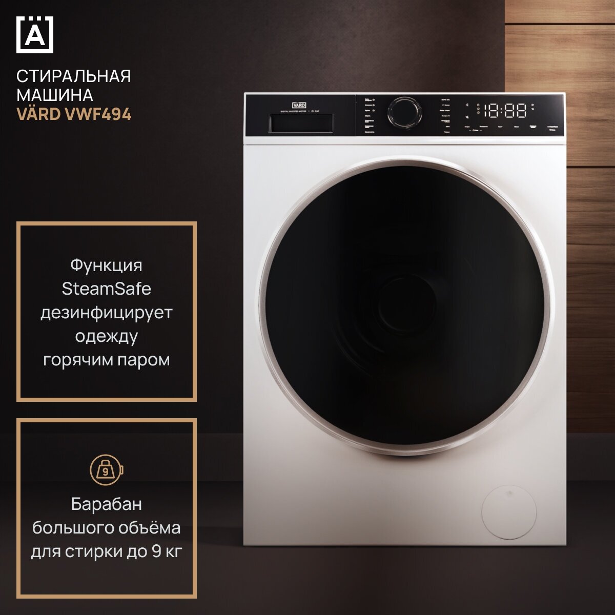 Стиральная машина VARD белого цвета с максимальной загрузкой 9 кг и скоростью отжима 1400 об/мин обладает стильным лаконичным дизайном и большой вместительностью. Инверторный мотор - современная технология привода барабана в стиральных машинах. В моторе используется инвертор (частотный преобразователь), позволяющий с высокой точностью регулировать скорость и контролировать необходимую оборотную частоту. Отсутствие коллектора с щётками позволяет этим двигателям отличаться тихой работой, повышенной надёжностью и меньшим энергопотреблением. Сенсорная панель, оснащённая цветным дисплеем, облегчает управление функциями бытовой техники и наглядно представляет всю необходимую информацию о процессе стирки. Машина оснащена удобным большим люком диаметром 36 см. Функция SteamSafe - обрабатывает одежду горячим паром, уничтожая микробы и бактерии. Функцию можно подключить на трёх программах: «Интенсивная» — для глубокой очистки после сильных загрязнений, «Куртки» - для обработки внешних тканей уличной одежды без повреждения наполнителя и «Анти-аллергия» — для удаления мелких частиц пыли, пыльцы растений и других аллергенов. Класс А энергоэффективности стиральной машины позволит снизить ваши расходы за электроэнергию и внести свой вклад в защиту окружающей среды. Функция блокировки от детей позволяет на время отключить сенсорную панель, чтобы предотвратить случайные нажатия или изменение программы ребёнком.