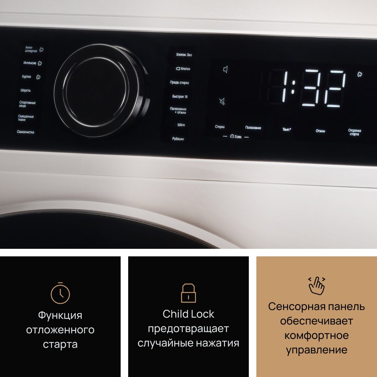 | Программы (режимы) стирки | Анти-аллергия, Быстрая стирка, Деликатная стирка, Интенсивная, Куртки, Отжим, Полоскание и отжим, Предварительная, Рубашки, Смешанная стирка, Спортивная одежда, Хлопок, Хлопок эко, Шелк, Шерсть |
