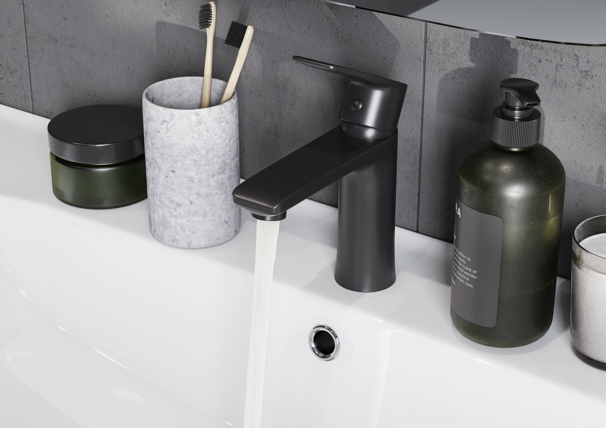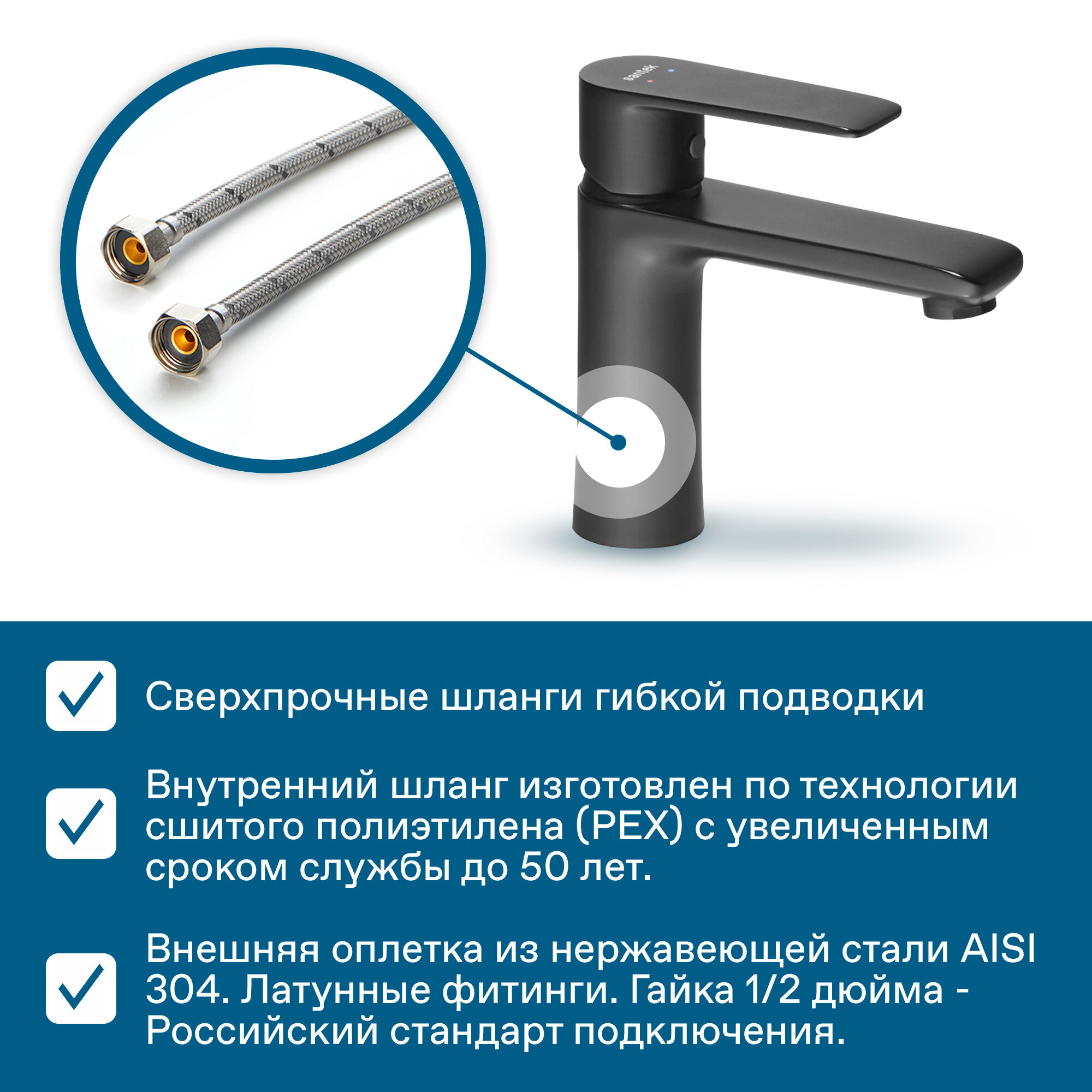 Santek Арма Смеситель однорычажный для раковины, черный матовый- установка на одно отверстие;- экономичный расход воды 6 литров/мин (при давлении 3 бар);- ровный и мягкий поток без брызг за счет насыщения струи воды воздухом;- гибкая подводка G1/2";- сверхпрочные шланги гибкой подводки, изготовленные по технологии сшитого полиэтилена (PEX) и сроком службы до 50 лет, в оплетке из нержавеющей стали AISI 304.- керамический картридж ?35 мм, плавный ход рычага смесителя, контроль и точность при выборе напора и температуры воды;- долгий срок службы, герметичность и безопасность для здоровья за счет использования высококачественных материалов и надежных компонентов;- черная поверхность с приятным матовым эффектом.