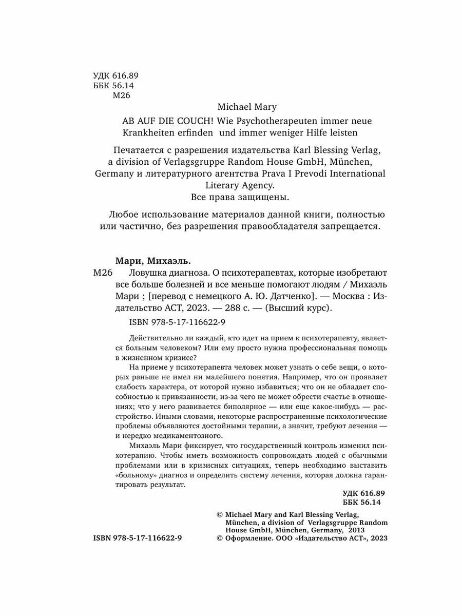 Ловушка диагноза. О психотерапевтах которые изобретают все больше болезней и все меньше помогают людям (Михаэль Мари); Издательство АСТ, 2013