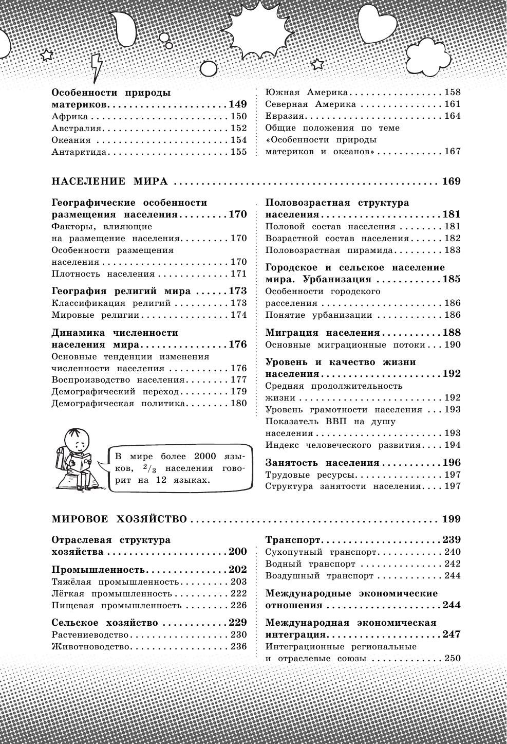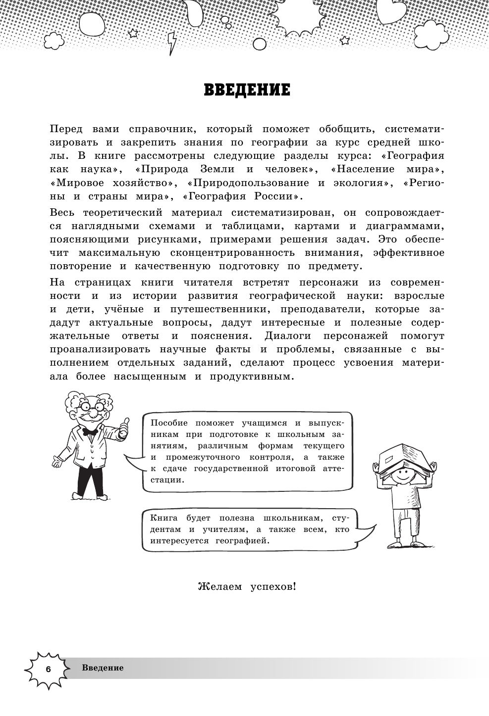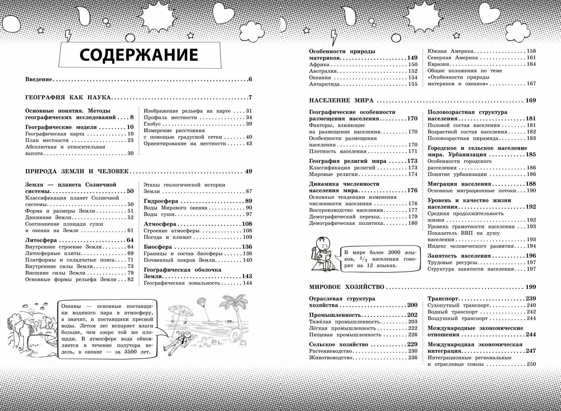В книге представлены разделы «География как наука», «Природа Земли и человек», «Население мира», «Мировое хозяйство», «Природопользование и экология», «Регионы и страны мира», «География России».