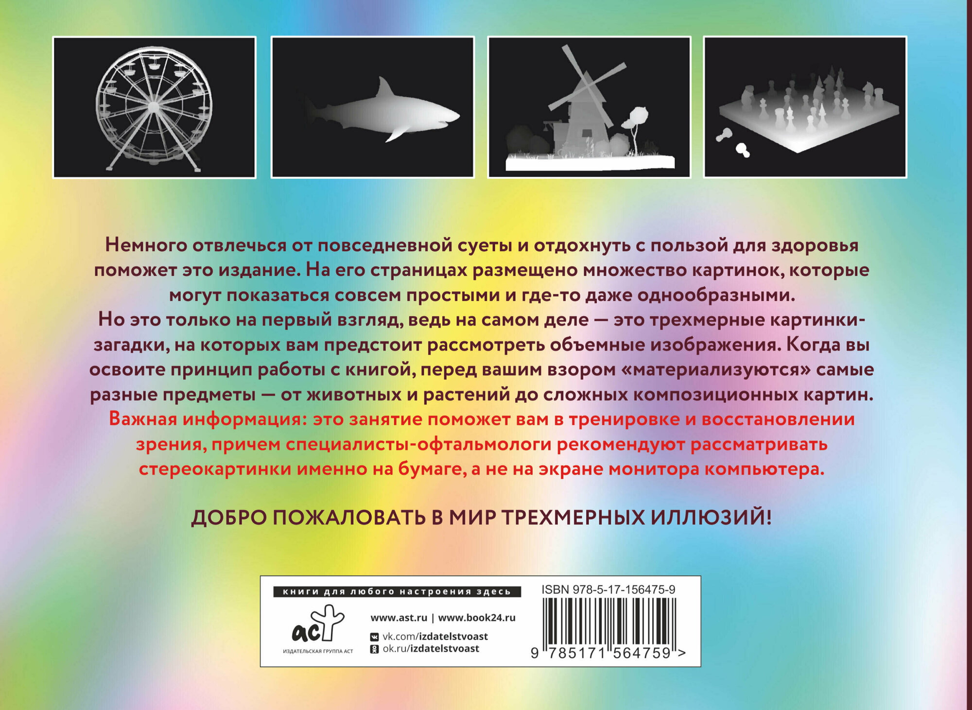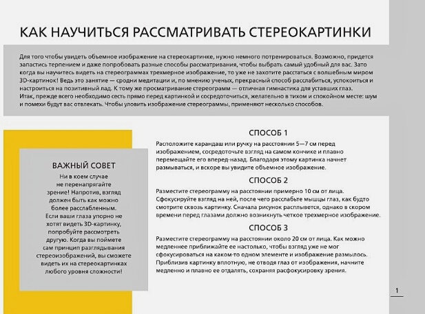 Немного отвлечься от повседневной суеты и отдохнуть с пользой для здоровья поможет это издание. На его страницах размещено множество картинок, которые могут показаться совсем простыми и где-то даже однообразными. Но это только на первый взгляд, ведь на самом деле – это трехмерные картинки-загадки, на которых вам предстоит рассмотреть объемные изображения. Когда вы освоите принцип работы с книгой, перед вашим взором «материализуются» самые разные предметы – от животных и растений до сложных композиционных картин.