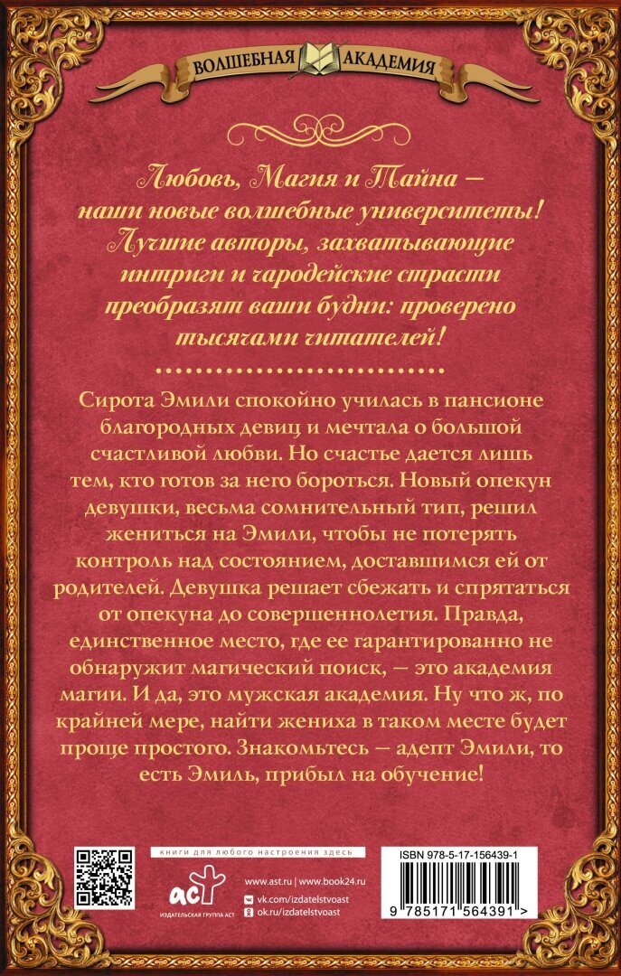 Сирота Эмили спокойно училась в пансионе благородных девиц и мечтала о большой счастливой любви. Но счастье дается лишь тем, кто готов за него бороться. Новый опекун девушки, весьма сомнительный тип, решил жениться на Эмили, чтобы не потерять контроль над состоянием, доставшимся ей от родителей. Девушка решает сбежать и спрятаться от опекуна до совершеннолетия. Правда, единственное место, где ее гарантированно не обнаружит магический поиск, — это академия магии. И да, это мужская академия. Ну что ж, по крайней мере, найти жениха в таком месте будет проще простого. Знакомьтесь — адепт Эмили, то есть Эмиль, прибыл на обучение!
