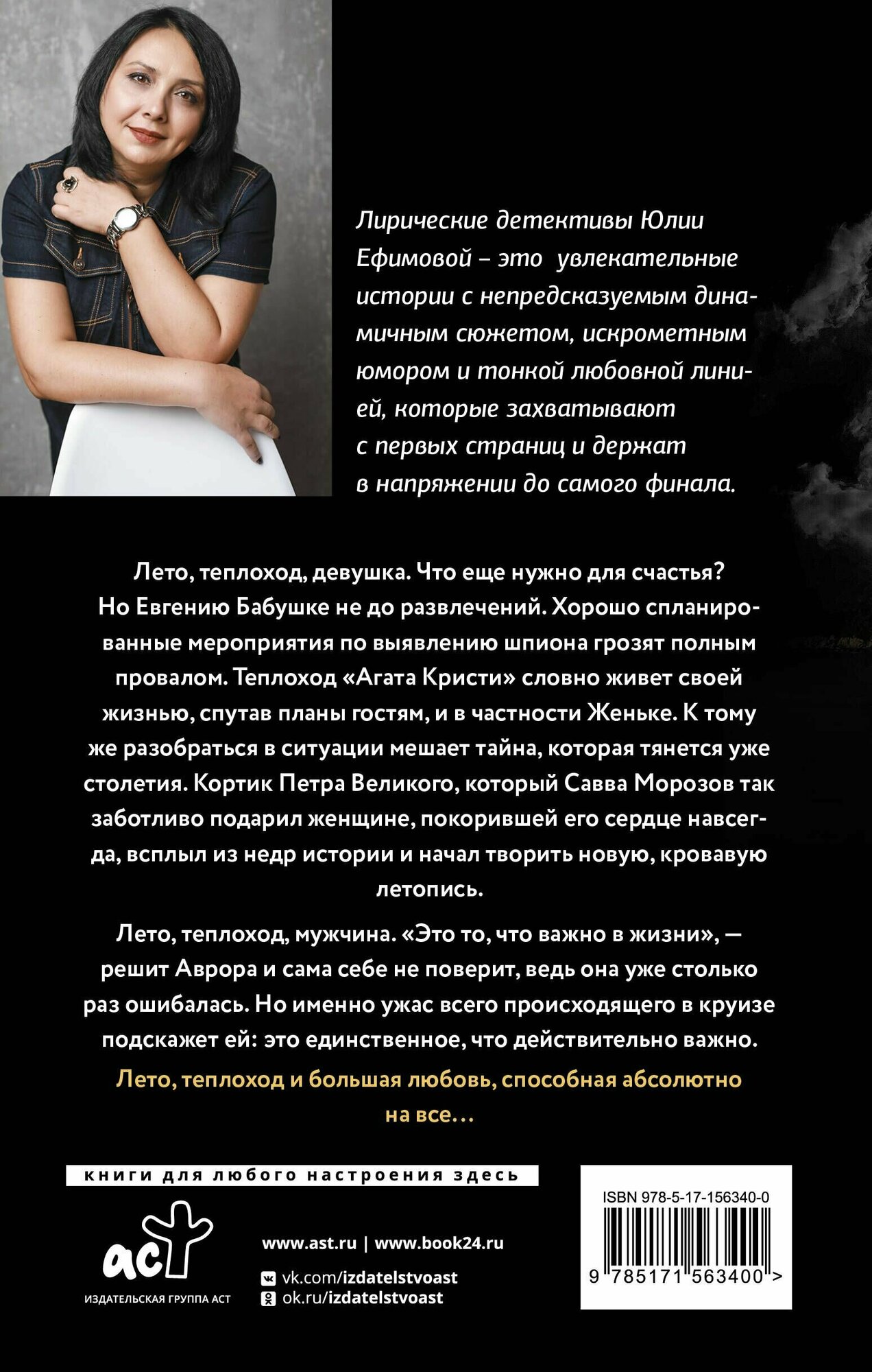 Лето, теплоход, девушка. Что еще нужно для счастья? Но Евгению Бабушке не до развлечений. Хорошо спланированные мероприятия по выявлению шпиона грозят полным провалом. Теплоход "Агата Кристи" словно живет своей жизнью, спутав планы гостям и, в частности Женьке. К тому же разобраться в ситуации мешает тайна, которая тянется уже столетия. Кортик Петра Великого, который Савва Морозов так заботливо подарил женщине, покорившей его сердце навсегда, всплыл из недр истории и начал творить новую, кровавую летопись.