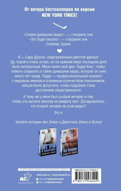 Я — Сара Доусон, перегруженный работой адвокат. Да, порой я очень устаю, но по крайней мере последнее дело было интересным. Меня нанял мой друг Тедди Кинг, чтобы помочь сохранить в тайне домашнее видео, которое он снял много лет назад. А, учитывая, что Тедди — профессиональный хоккеист с мировым именем и огромным количеством поклонников, нельзя было допустить, чтобы подобное стало достоянием общественности.