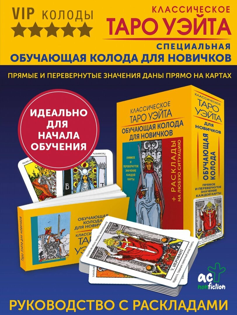 Перед вами первая специальная обучающая колода для новичков, в которой прямые и перевернутые значения указаны прямо на картах. Это значительно упрощает обучение, делает его максимально удобным и эффективным. Это классическое Таро Артура Уэйта, известное по всему миру! Оно содержит 78 карт — 22 Старших, 56 Младших Арканов. На каждой карте указано значение, что помогает понять смысл карты и быстро запомнить его.
