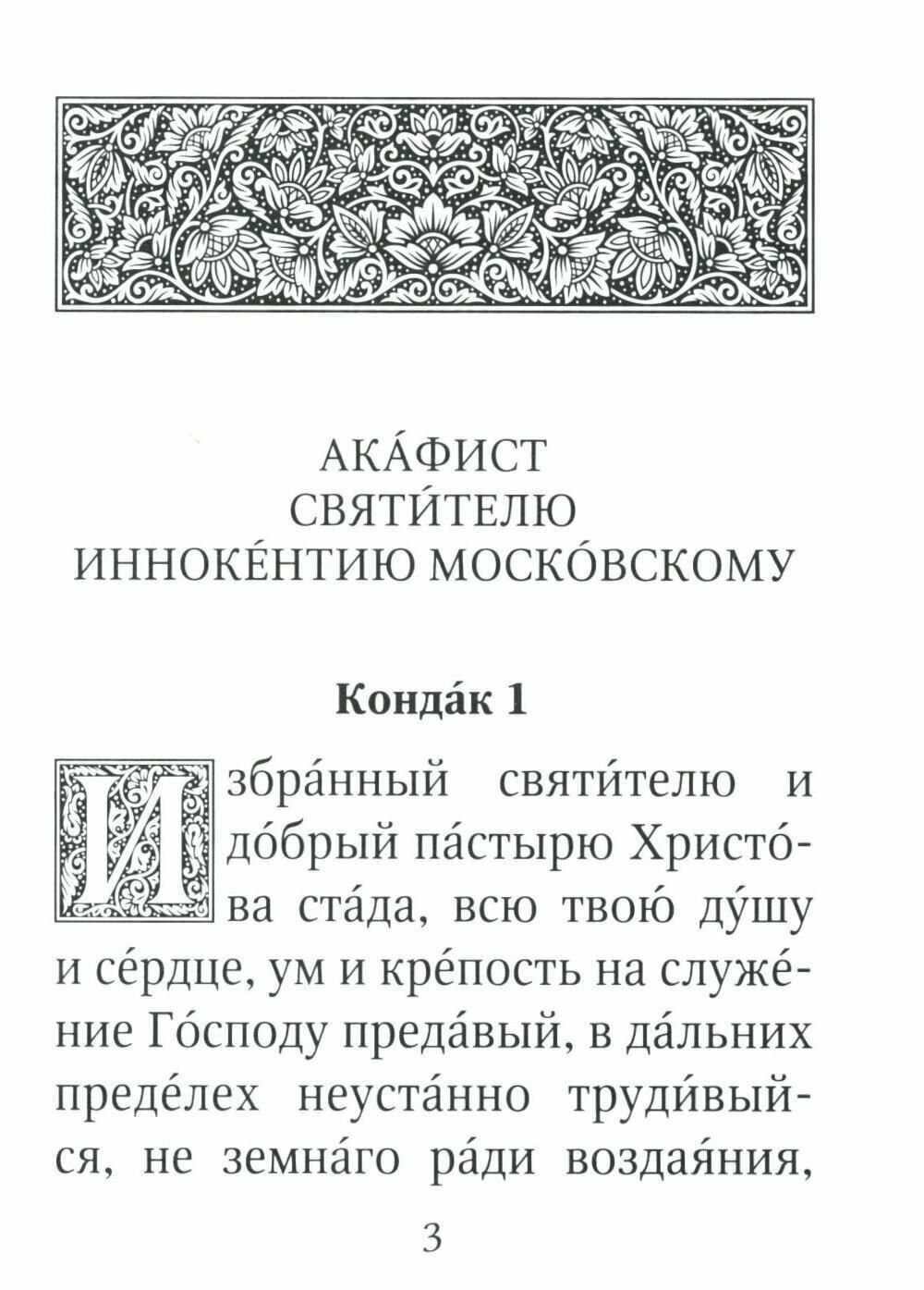Акафист святителю Иннокентию напечатан крупным гражданским шрифтом с ударениями. Издание дополнено житием и небольшим словарём.