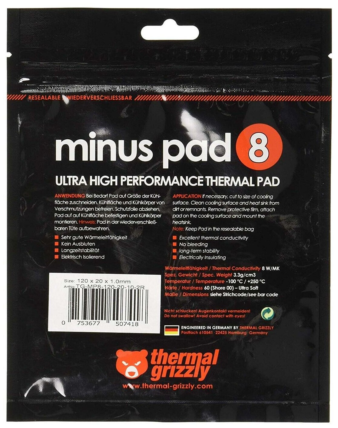 Термопрокладка Thermal Grizzly Minus Pad 8 120x20x1.5мм (TG-MP8-120-20-15-1R) Minus Pad 8 20x120x1.5 мм (TG-MP8-120-20-15-1R)