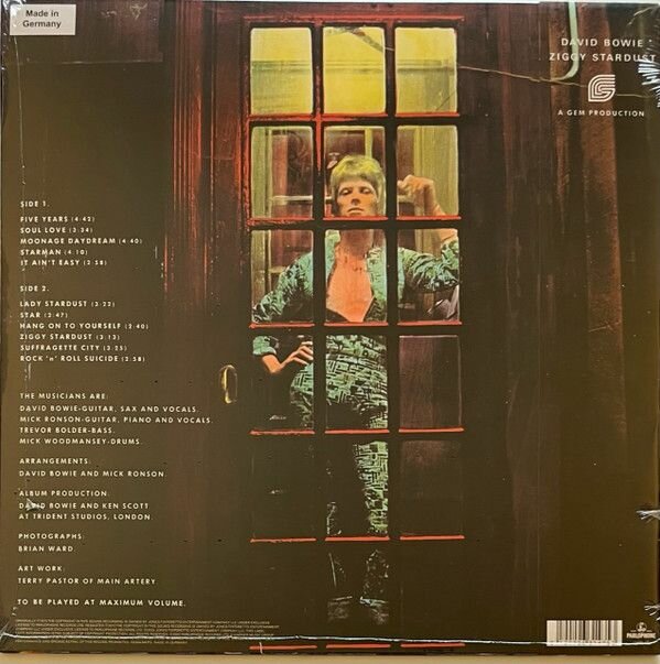 David Bowie – The Rise And Fall Of Ziggy Stardust And The Spiders From Mars (Reissue, Remastered, Stereo, 180g) LP«The Rise and Fall of Ziggy Stardust and the Spiders from Mars» (чаще сокращается до Ziggy Stardust, рус. «Взлёт и падение Зигги Стардаста и Пауков с Марса») — пятый студийный и первый концептуальный альбом британского музыканта Дэвида Боуи, изданный в 1972 году. Диск достиг пятого места в хит-параде Великобритании и 75-го — в американском чарте журнала Billboard. Одноимённый фильм был срежиссирован документалистом Донном Аланом Пеннибэйкером в 1973 году, позже фильм был переиздан к 30-летнему юбилею альбома. Альбом занимает 35-е место в списке Rolling Stone «500 величайших альбомов всех времён». В 2017 году запись была отмечена как «культурно, исторически, и эстетически значимая» и внесена в Национальный реестр аудиозаписей Библиотеки Конгресса США. Дэвид Боуи (настоящее имя Дэвид Роберт Джонс, David Robert Jones, родился 8 января 1947 года в пригороде Лондона Брикстон, умер 10 января 2016 года) - британский рок-музыкант. Боуи называют хамелеоном рока из-за его способности предугадывать и даже создавать музыкальные тренды, а также постоянно менять свой образ, иногда воссоздавая себя. Самое первое появление в шоу-бизнесе состоялось в 1964 году, выпуском сингла Liza Jane / Louie, Louie Go Home. После этого сингла, выпущенного под именем Davie Jones совместно с группой The King Bees, Дэвид с 1964 по 1966 годы включительно, выпустил 6 синглов, записал большое количество студийного материала и с 1966 года стал BOWIE. В этом же году был выпущен его первый альбом или если быть более точным полное издание синглов выпущенных компанией Pye - Dont Be Fooled By The Name. В июне 1967 года был выпущен полноценный дебютный альбом David Bowie. Боуи заявил о себе синглом 1969 года Space Oddity и приобрел культовый статус благодаря концептуальному альбому The Rise And Fall Of Ziggy Stardust And The Spiders From Mars 1972 года. С тех пор Дэвид Боуи смело экспериментирует с разными стилями — от классического рока и глэма до электроники и метала. При этом Боуи всегда удавалось сохранять свой собственный узнаваемый стиль, успешно совмещая его с актуальными музыкальными направлениями. Мультиинструменталист: играл на гитаре, фортепиано, саксофоне, виолончели и др. Актёр: снялся в фильмах Человек, который упал на Землю (The Man Who Fell to Earth, 1976), Голод (The Hunger, 1983, с Катрин Денев и Сюзан Сэрандон), Лабиринт (Labyrinth, 1986, с Дженнифер Коннели), Престиж (The Prestige, 2006). В фильме Баскья (Basquiat, 1996) Боуи сыграл Энди Уорхола. TracklistA1 Five Years 4:42A2 Soul Love 3:34A3 Moonage Daydream 4:40A4 Starman 4:10A5 It Aint Easy 2:58B1 Lady Stardust 3:22B2 Star 2:47B3 Hang On To Yourself .