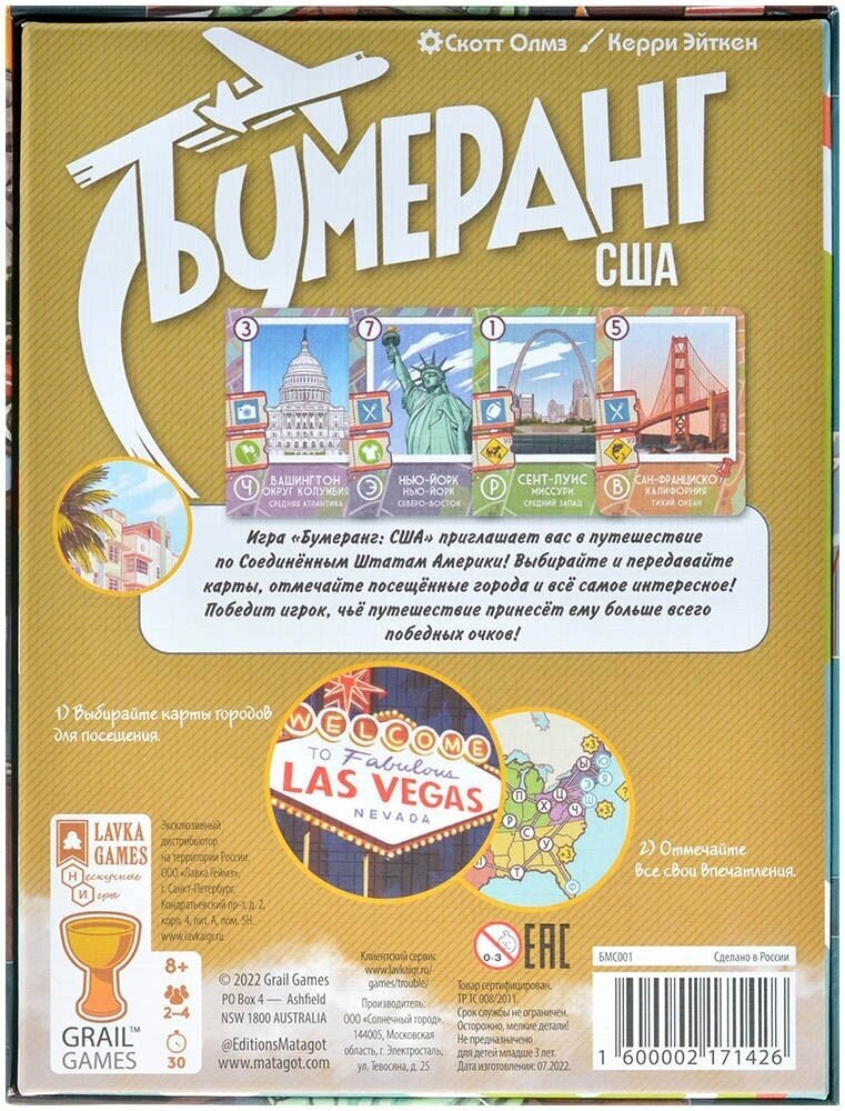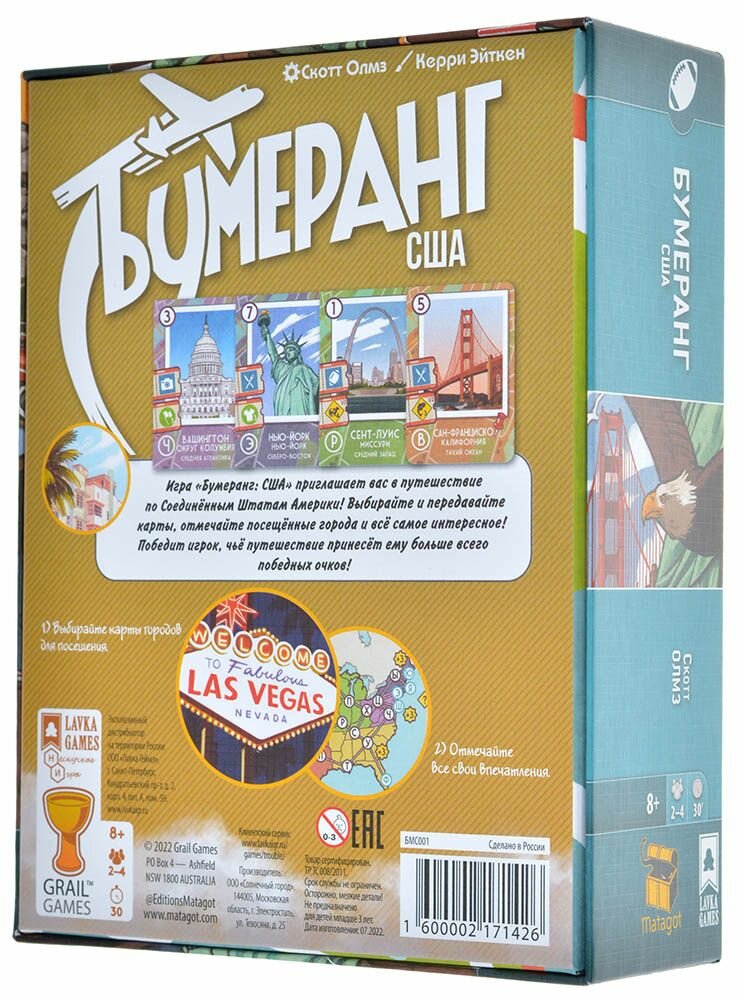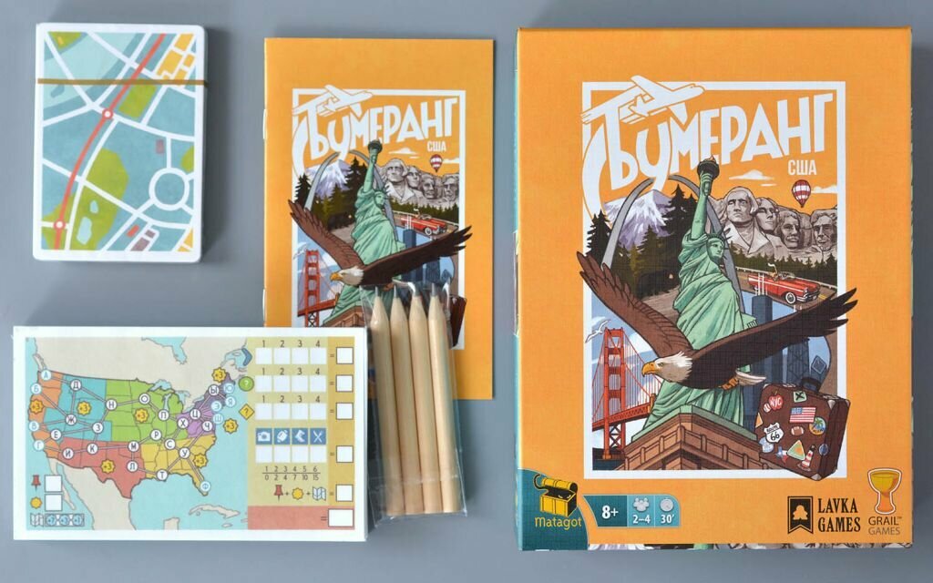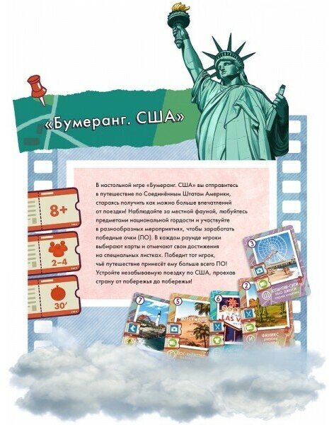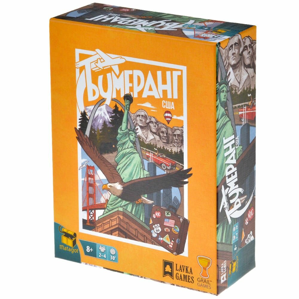 В настольной игре "Бумеранг: США" вам предстоит отправиться в Америку! Посетите каждый штат, полюбуйтесь местными достопримечательностями, посетите различные мероприятия и запечатлейте свои приключения!
