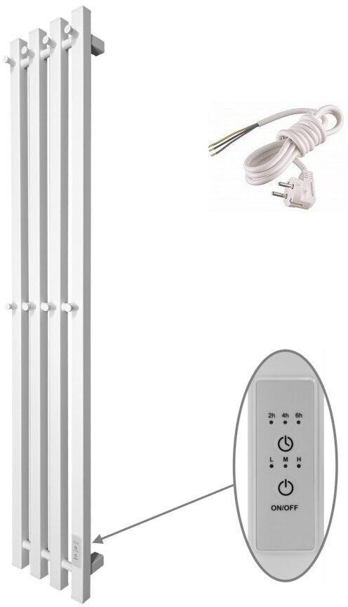 Встроенная функция регулировки температуры: 40 / 50 / 60 градусов Экономичность: Полотенцесушитель снабжен панелью управления. Кнопка включения/выключения и таймер на 2 / 4 / 6 часов , который позволяет включать изделие на ограниченное время. Эта функция дает возможность экономить электричество. Удобство монтажа: Полотенцесушитель крепится к стене на четыре держателя. Скрытое подключение: Благодаря приваренным в нижней части вертикальных труб в которых соединяется электропроводка, возможно скрытое подключение к электричеству справа. Подключение в розетку: В комплекте также имеется шнур с вилкой, который будет необходим при подключении к розетке. Панель включения: режим №1 — работа в течение 2 часов с последующим отключением. режим №2 — работа в течение 4 часов с последующим отключением. режим №3 — работа в течение 6 часов с последующим отключением. Комплектация: Телескопическое крепление без кольца - 3 шт; Комплект скрытого монтажа - 1 шт; кабель с вилкой 220В - 1 шт