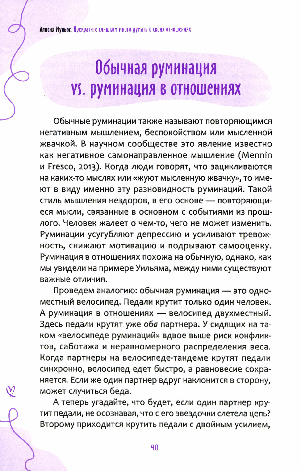 «Все начинается с одной мысли. Эта мысль — мнение, неверное толкование, прогноз или оценка — тянет за собой новые мысли. Единожды возникнув, они, подпитываемые тревожностью, уже не исчезают. Они растут и множатся, и вы начинаете гонять их по кругу. Постепенно у вас формируется новый мысленный образ партнера, и тогда вы закрываетесь друг от друга, перестаете делиться переживаниями и чувствами, в паре пропадает взаимопонимание. Вы все чаще недовольны друг другом, и вам начинает казаться, что у отношений нет будущего…