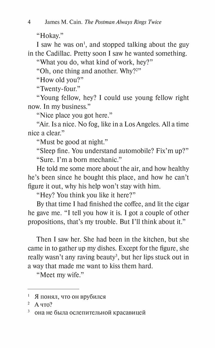 К жизни нужно относиться легко. Колесить по стране, перебиваясь случайными заработками? Не вопрос. Устроиться на работу в придорожную забегаловку и совратить жену хозяина? Сделано. Задумать избавиться от обманутого мужа и пойти на убийство? Запросто. Не получилось? Ну, попробуем ещё раз. Примерно так живёт главный герой романа, бродяга Фрэнк Чемберс. До поры до времени ему удаётся выходить сухим из воды, однако со второй попытки возмездие настигает преступников. Почтальон всегда звонит дважды…