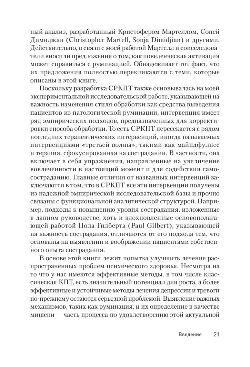 Руминация — это навязчивый тип мышления, когда в голове человека возникают одни и те же мысли, однако в большинстве своем эти мысли отрицательные. Это нормальный и естественный процесс, особенно в кризисные ситуации, а иногда и полезная реакция для выживания. Однако такие мысли могут вытеснять другую психическую деятельность, затягивая исключительно в негативный цикл. Такой принцип мышления присущий каждому из нас, однако, попадя в эту ловушку, это может привести к хронической тревоге и глубокой депрессии. Доктор Эдвард Уоткинс - профессор экспериментальной и прикладной клинической психологии, практиковал в течении 20 лет, специализируясь на депрессии. До Уоткинса никто не мог дать серьезных положений по борьбе с руминацией в лечении депрессии. Депрессия лечилась с помощью КПТ, однако руминация особо не затрагивалась. Свою книгу он адресовал своим коллегам, врачам, практикующим. Здесь он описал свое изучение излечения депрессии через борьбу с руминацией и то, как это применять на практике. Такое лечение называется СРКПТ - сфокусированная на руминации когнитивно-поведенческая терапия, как новая форма КПТ. Ключевое практическое правило по борьбе с руминацией будет в этом вопросе: "Приводит ли меня эти размышления к решению проблемы, к логичному плану или хотя бы просто к какому-то ответу?". В своей книге Доктор Уоткинс рассматривает эффект руминации под всеми возможными углами, тем самым подводя нас к объяснению принципа СРКПТ. Кстати, он упоминал, что такая терапия может подойти и для самостоятельной терапии.