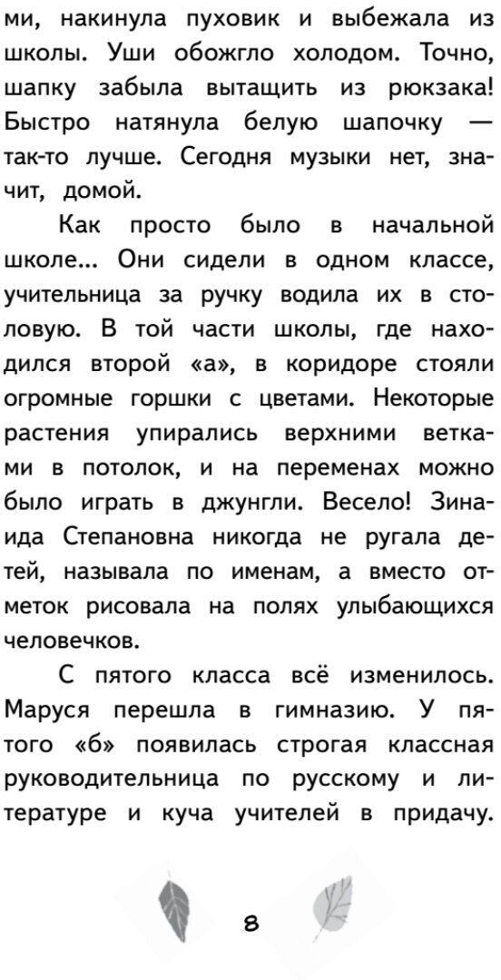 Ух! Как же точно от лица переживающего ребенка описана вся эта школьная "кухня". Аж самой вспомнились эти недопонимания с учителями, травля от одноклассников и бои с алгеброй. Главная героиня только что перешла в 5 класс и при этом поменяла школу на гимназию. Она описывает нам всю эту тягость нового: новые предметы, новые учителя, новые классы и новые ребята. Сама по себе пятиклассница Маруся очень добрая и спокойная девочка с большим воображением, но школьные проблемы не дают ей спокойно жить, а уж тем более учиться. Вспомните сами, какая для того возраста это была проблема! Текст простой и быстро читается, а учитывая всю искренность и правду переживаний школьницы, эта книга может стать прекрасным началом для знакомства с литературой для Вашего ребенка. Указанный возраст на книге - 6 лет, хотя я бы взяла ребенку чуть постарше, чтобы он уже действительно мог проникнуться. И казалось бы, Маруся совсем любит всю эту школьную суету, она не "душа компании", у нее происходят стычки с другими девочками, в которых учителя ее не защищают, а даже наоборот, усугубляют ситуацию, и, в конце концов, она, как и любой ребенок, хочет простого - спать. Но юному читателю, который в глубине души, скорее всего, будет переживать что-то похожее, этот рассказ поможет, в первую очередь, понять, что он не один в этой ситуации. Он так же не один, потому что в рассказе перед нами разворачивается картина вечно работающей мамы, однако, когда она все же узнает про состояние своего ребенка, то встает за нее горой, не смотря ни на что. И эта ситуация должна послужить примером не только для маленького читателя, но и для его родителей, поскольку доверие в семье - главное, что Вы должны дать своему ребенку.