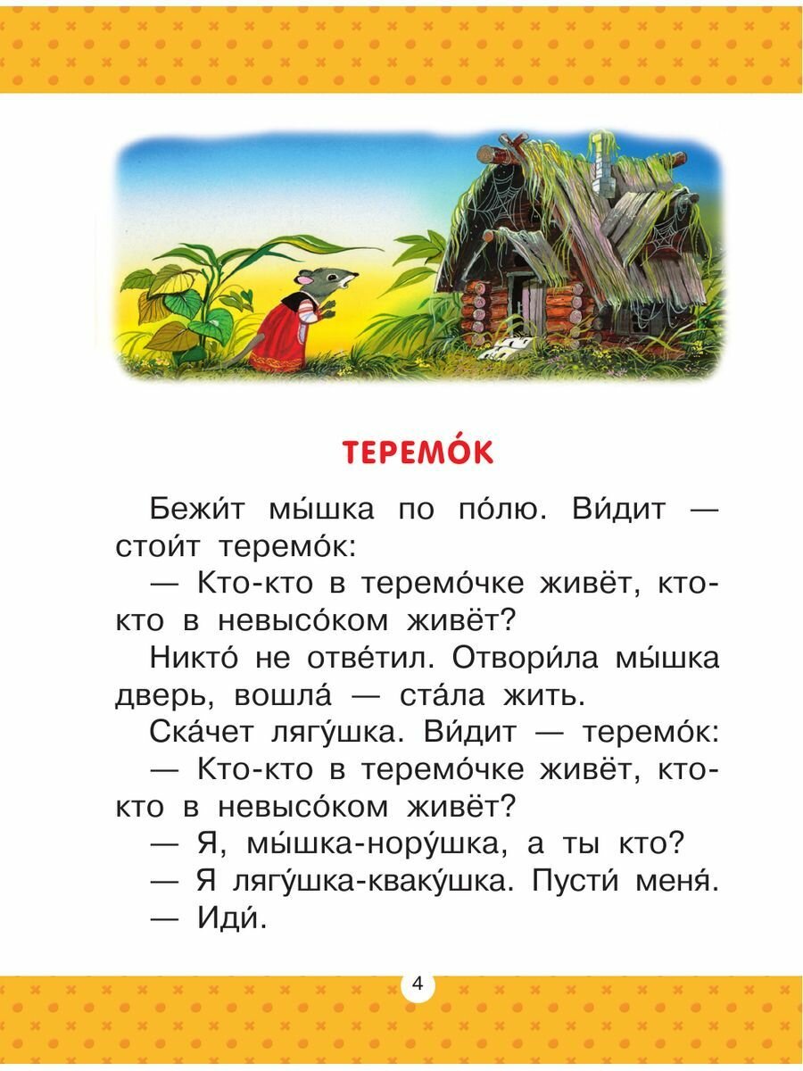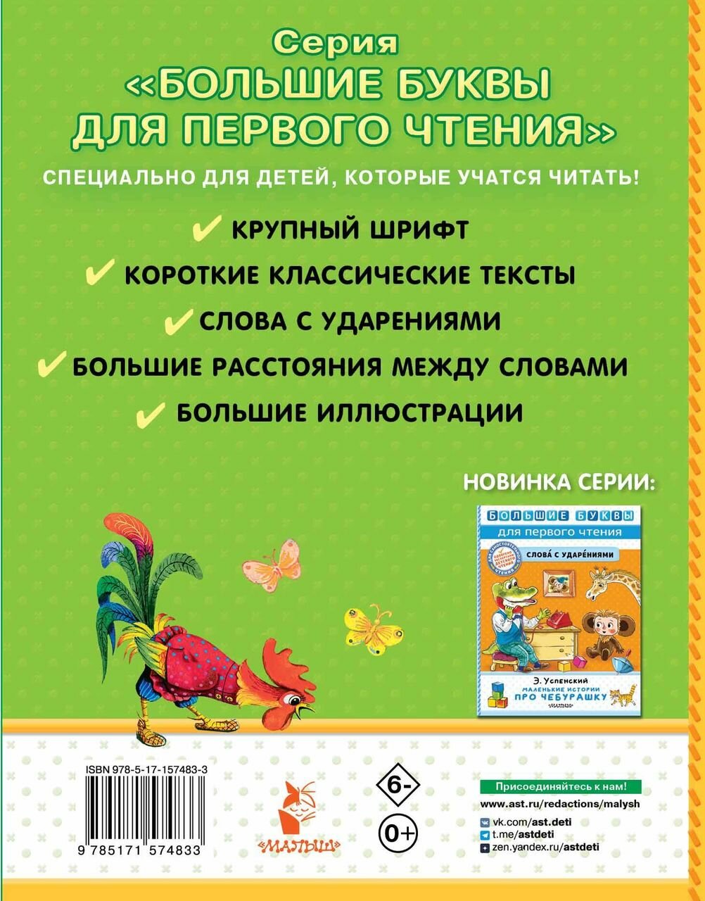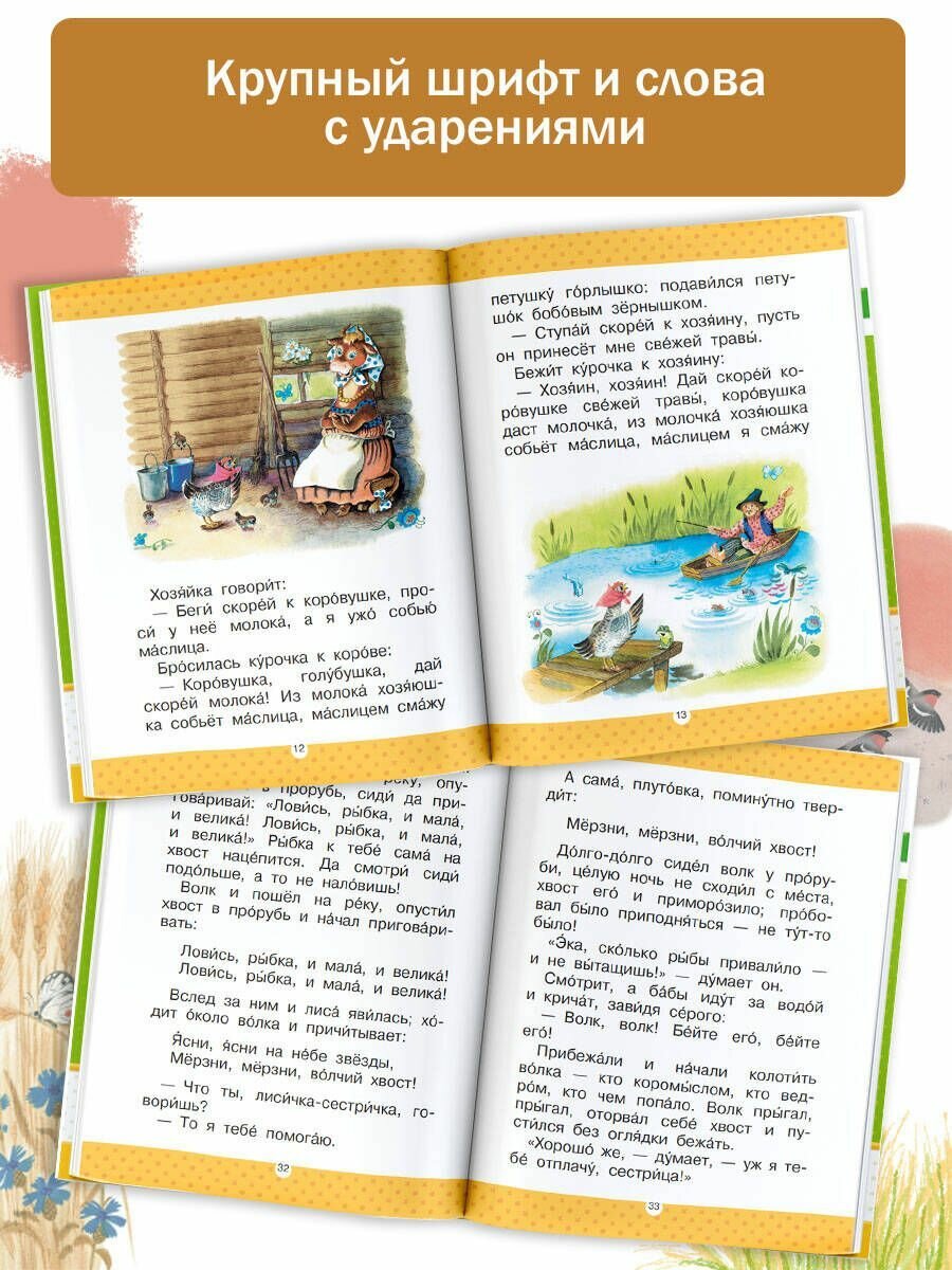 Этот сборник сказок предназначен для самостоятельного чтения. Это очень важный этап развития речи ребёнка. От того, насколько комфортно произойдёт переход от слушателя к читателю, будет зависеть быстрота чтения, понимание прочитанного и любовь к книгам. Начинать читать самостоятельно лучше по знакомым произведениям, которые дети уже слышали в раннем детстве. Маленькие читатели встретятся с героями русских народных сказок - с петушком, который подавился зёрнышком, а спасли его курочка, хозяин с хозяюшкой и кузнец. Никто не остался в стороне! А ещё с козой-дерезой, обманщицей и плутовкой, которая выгнала зайчика из его избушки... Но закончилось всё хорошо - зайка снова в своей избушке живёт, морковку грызёт, вам кланяется. В книге крупный шрифт и слова с ударениями.