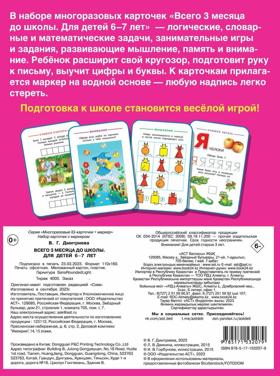 Скоро в школу? Кажется, что подготовка к 1 классу — тяжёлый труд? Поможет набор многоразовых IQ карточек «Всего 3 месяца до школы. Для детей 6-7 лет»! Ребёнок узнает много нового об окружающем мире, поиграет в занимательные игры, выполнит задания, развивающие мышление, внимание и память, подготовит руку к письму, научится рисовать забавных животных. К карточкам прилагается маркер на водной основе — любую надпись легко стереть.