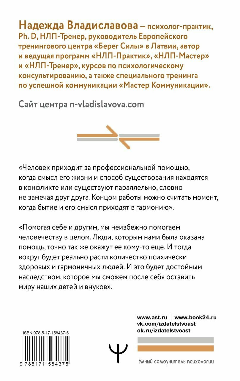 Автор книги Надежда Владиславова по праву считается одним из основателей Российской школы НЛП, имеет уникальный практический опыт, сформировавшийся во время работы в зоне боевых действий в Чечне и работы с наркозависимыми, обучала военных психологов, сотрудников Службы спасения и МЧС навыкам профессиональной коммуникации.