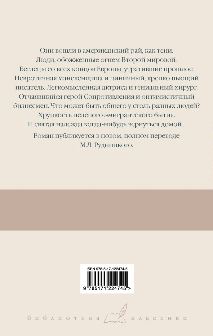 Они вошли в американский рай, как тени. Люди, обожженные огнем Второй мировой. Беглецы со всех концов Европы, утратившие прошлое. Невротичная манекенщица и циничный, крепко пьющий писатель. Легкомысленная актриса и гениальный хирург. Отчаявшийся герой Сопротивления и оптимистичный бизнесмен. Что может быть общего у столь разных людей? Хрупкость нелепого эмигрантского бытия. И святая надежда когда-нибудь вернуться домой...