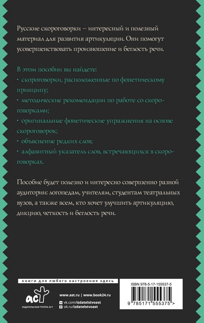 Пособие будет полезно и интересно совершенно разной аудитории: логопедам, учителям, студентам театральных вузов, а также всем, кто хочет улучшить артикуляцию, дикцию, четкость речи.