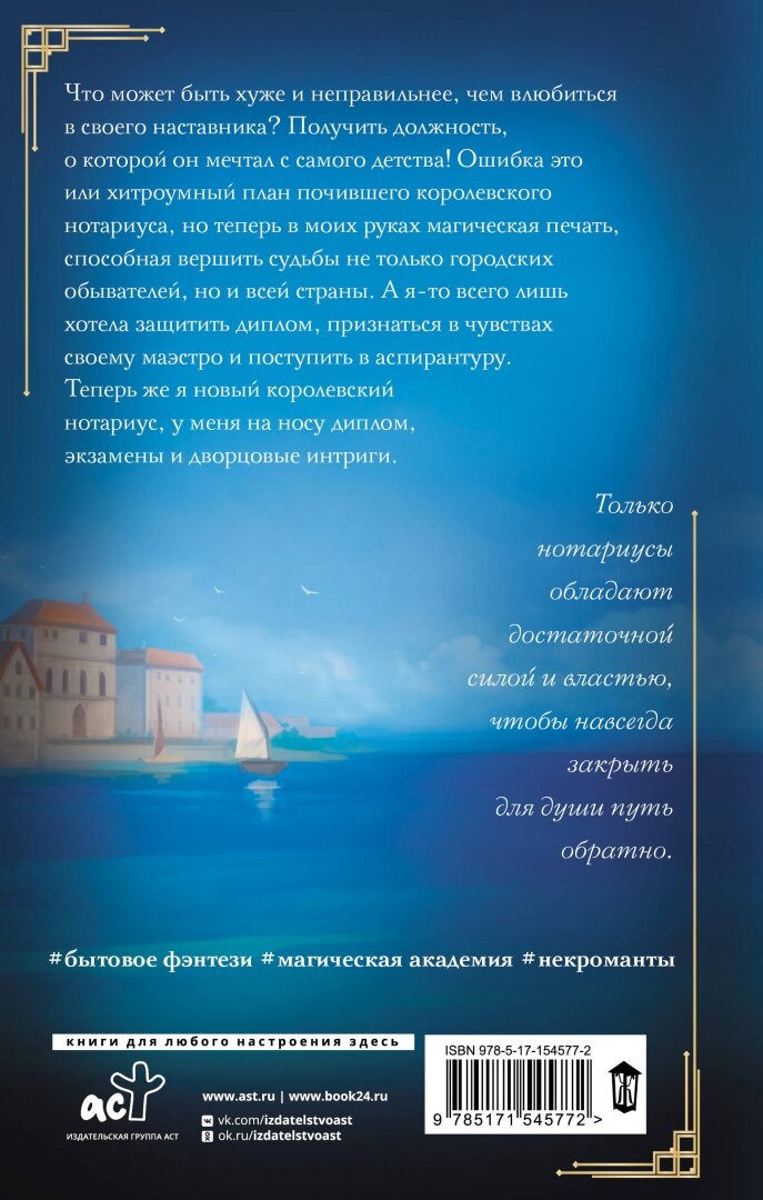 Что может быть хуже и неправильнее, чем влюбиться в своего наставника? Получить должность, о которой он мечтал с самого детства! Ошибка это или хитроумный план почившего королевского нотариуса, но теперь в моих руках магическая печать, способная вершить судьбы не только городских обывателей, но и всей страны. А я-то всего лишь хотела защитить диплом, признаться в чувствах своему маэстро и поступить в аспирантуру. Теперь же я новый королевский нотариус, у меня на носу диплом, экзамены и дворцовые интриги.