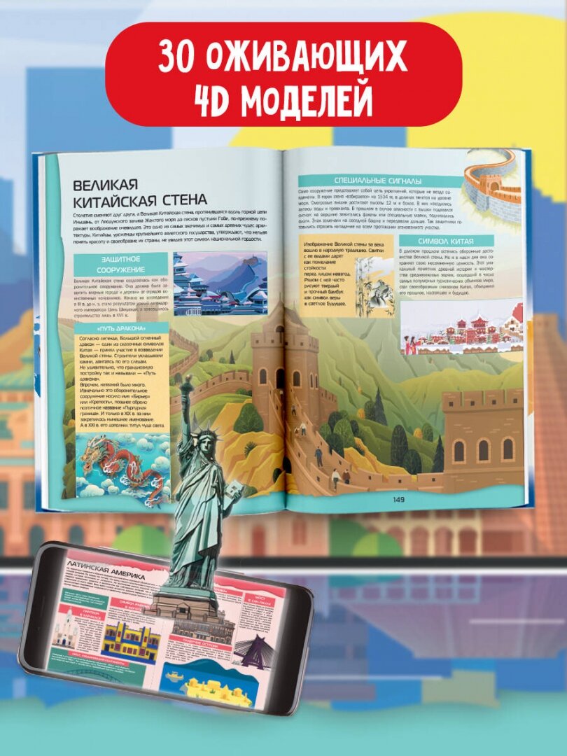 Большой 4D-атлас мира станет вашим гидом в захватывающем путешествии по всей планете. Он рассказывает о Мировом океане и шести континентах, их географии, природных особенностях, животном и растительном мире, интересных традициях и обычаях самых разных народов. Вы познакомитесь с многочисленными странами и их уникальными достопримечательностями, включая исторические памятники, национальные парки и места, богатые природными ресурсами. Книга расскажет о знаменитых городах и величественных сооружениях мира.