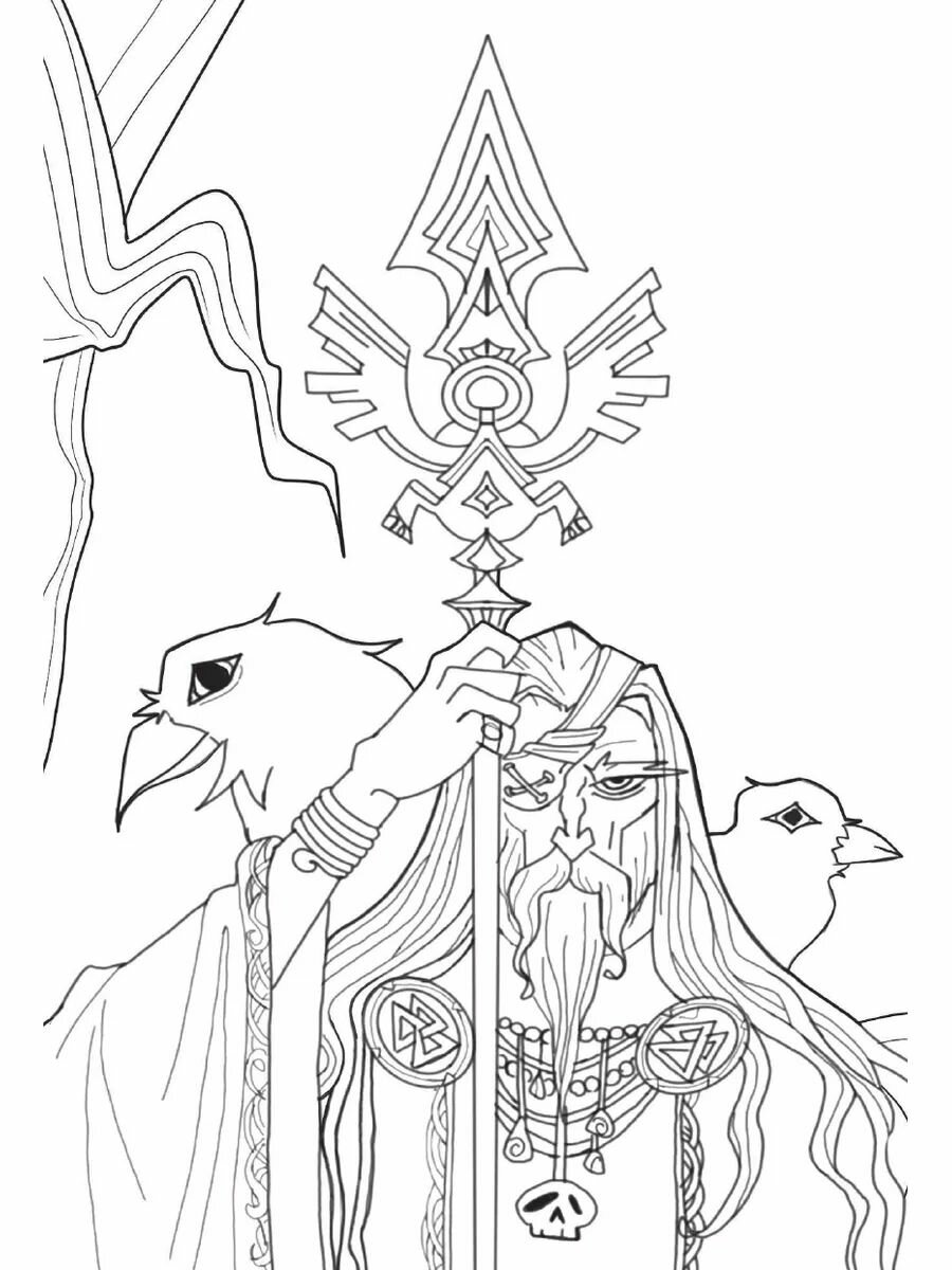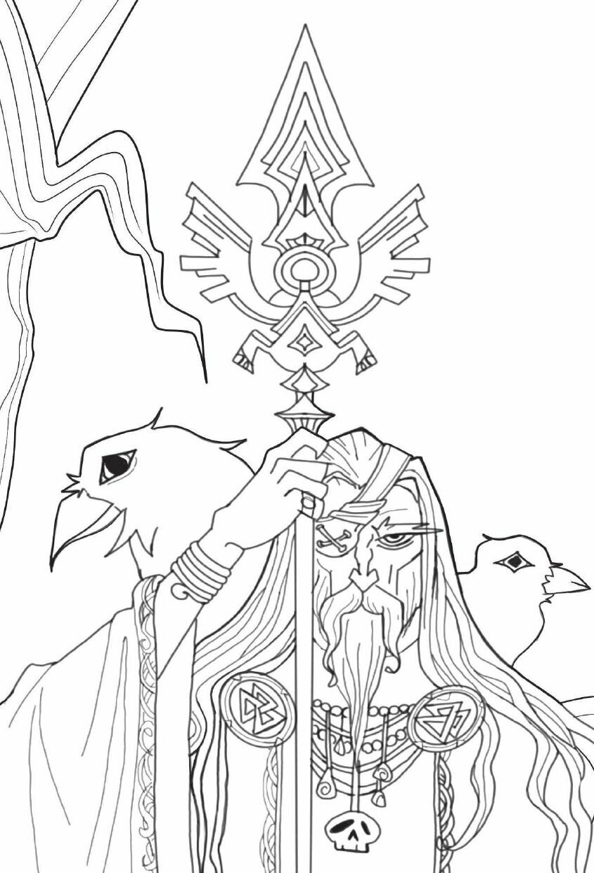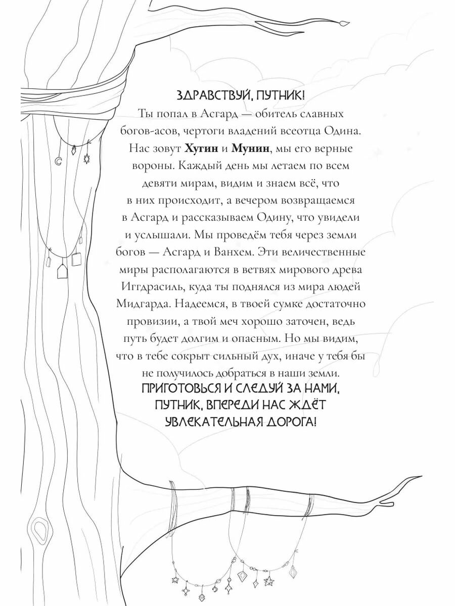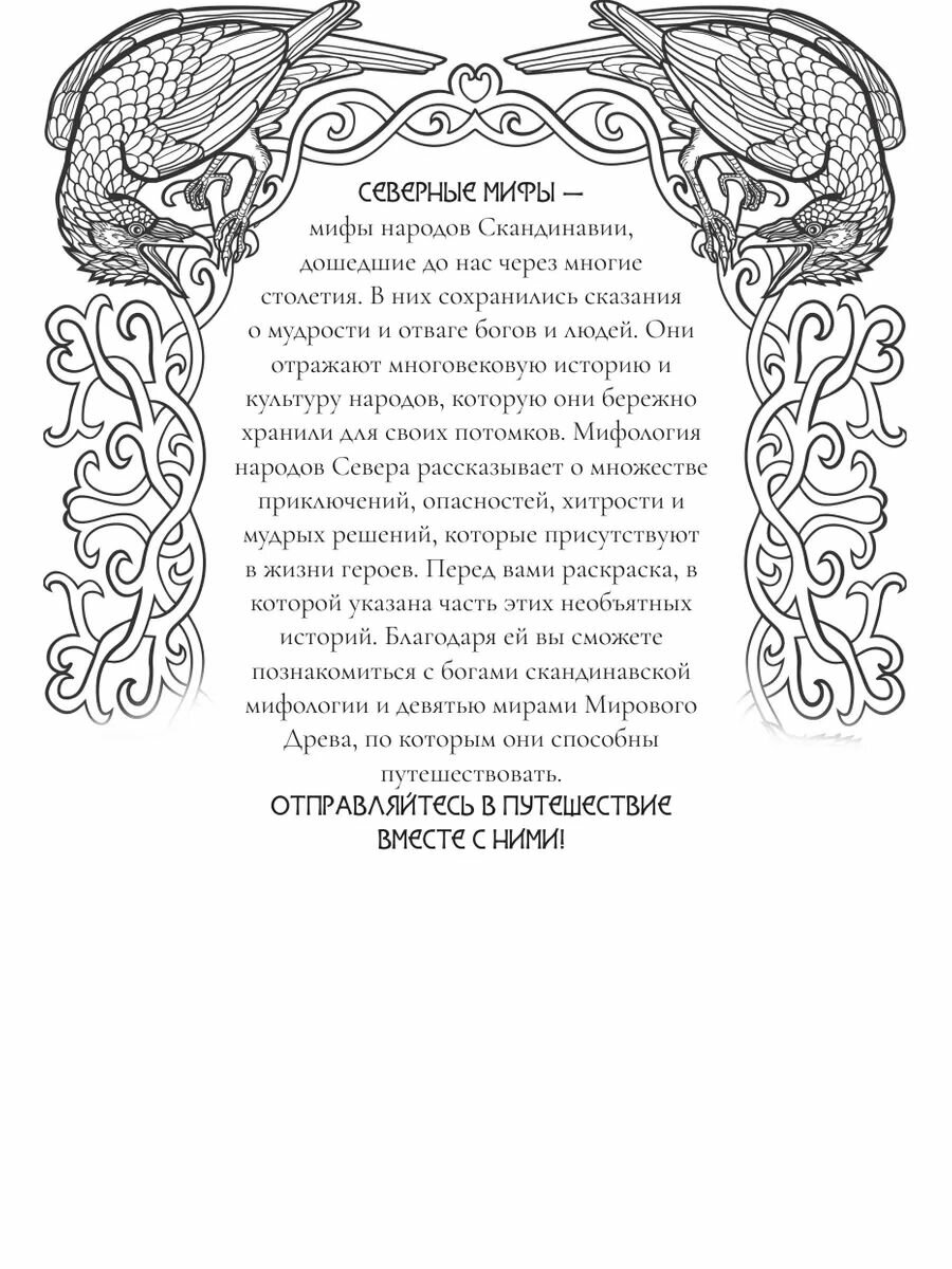 Здравствуй, пытливый человек! Эта раскраска - увлекательное и познавательное путешествие в миры скандинавских мифов - миры богов, ледяных великанов, двергов и альвов. Вместе с мудрыми воронами Хугином и Мунином, тебе предстоит путешествие по всем Девяти мирам древа Иггдрасиль, но самое главное - знакомство с богами Асгарда - асами и ванами, истории которых вдохновляют и завораживают.