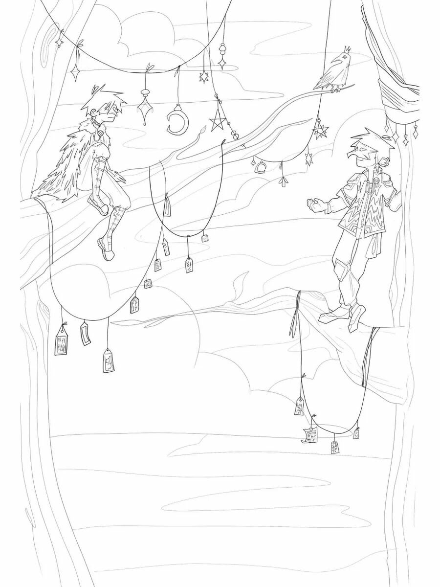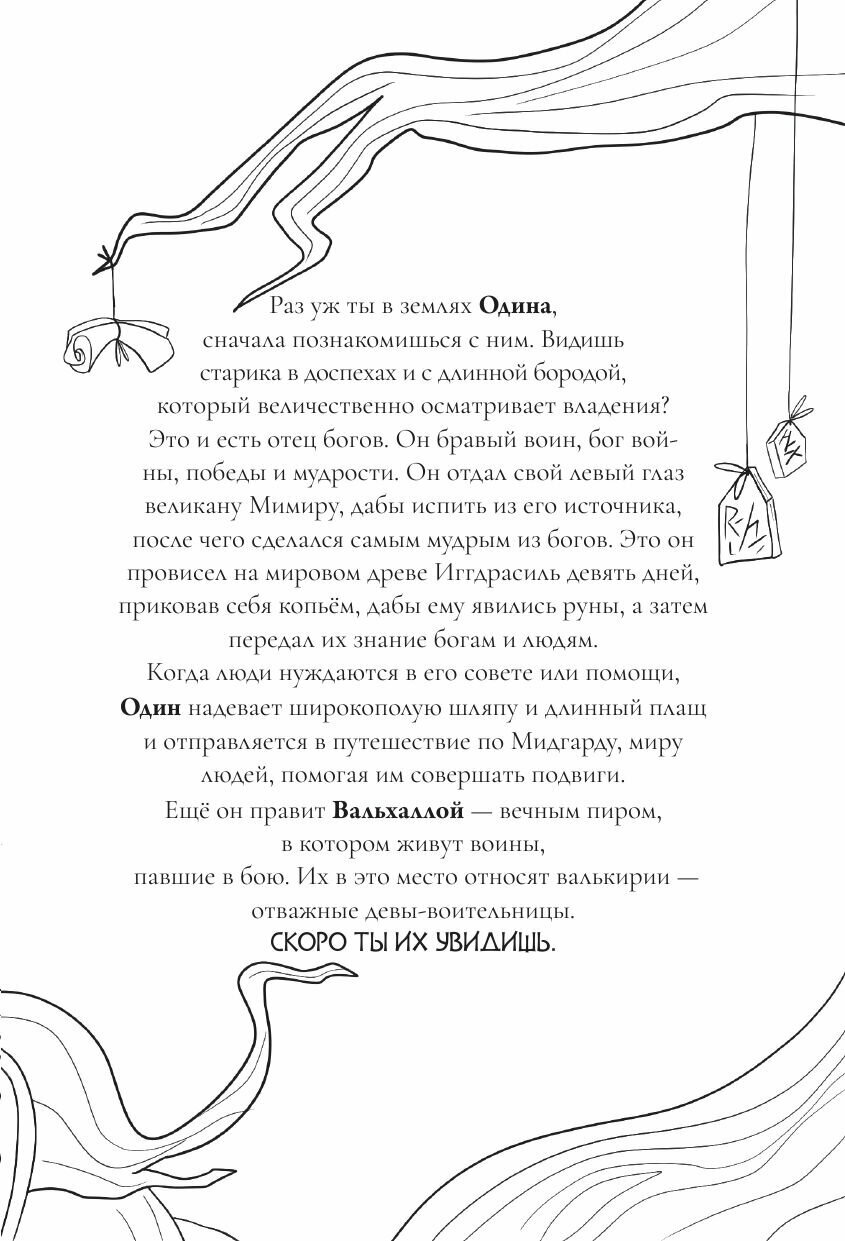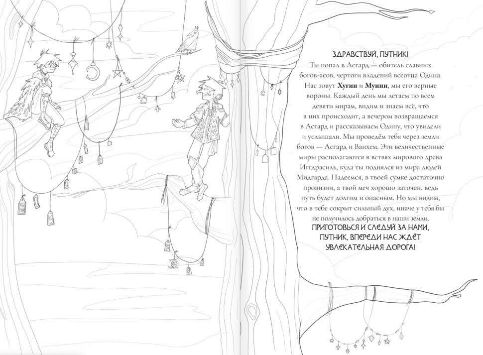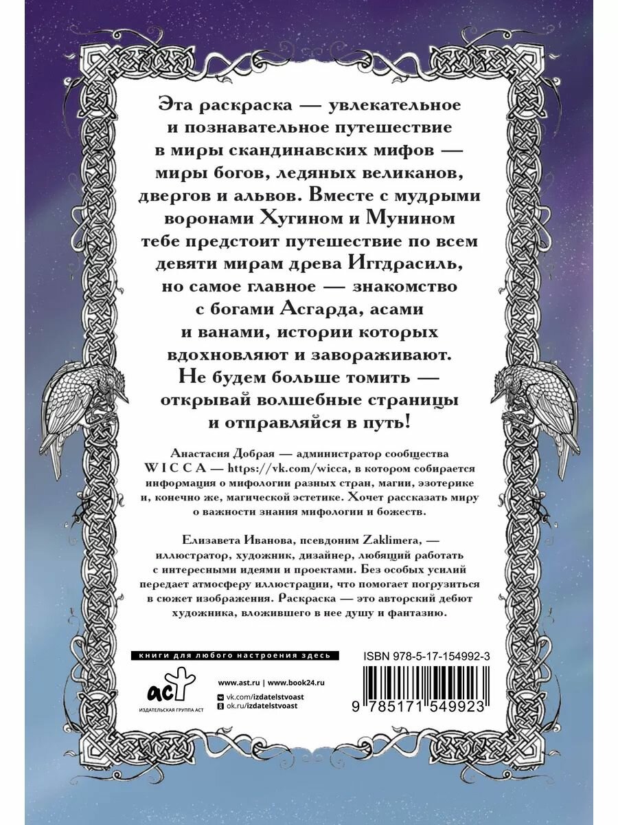 Здравствуй, пытливый человек! Эта раскраска - увлекательное и познавательное путешествие в миры скандинавских мифов - миры богов, ледяных великанов, двергов и альвов. Вместе с мудрыми воронами Хугином и Мунином, тебе предстоит путешествие по всем Девяти мирам древа Иггдрасиль, но самое главное - знакомство с богами Асгарда - асами и ванами, истории которых вдохновляют и завораживают.