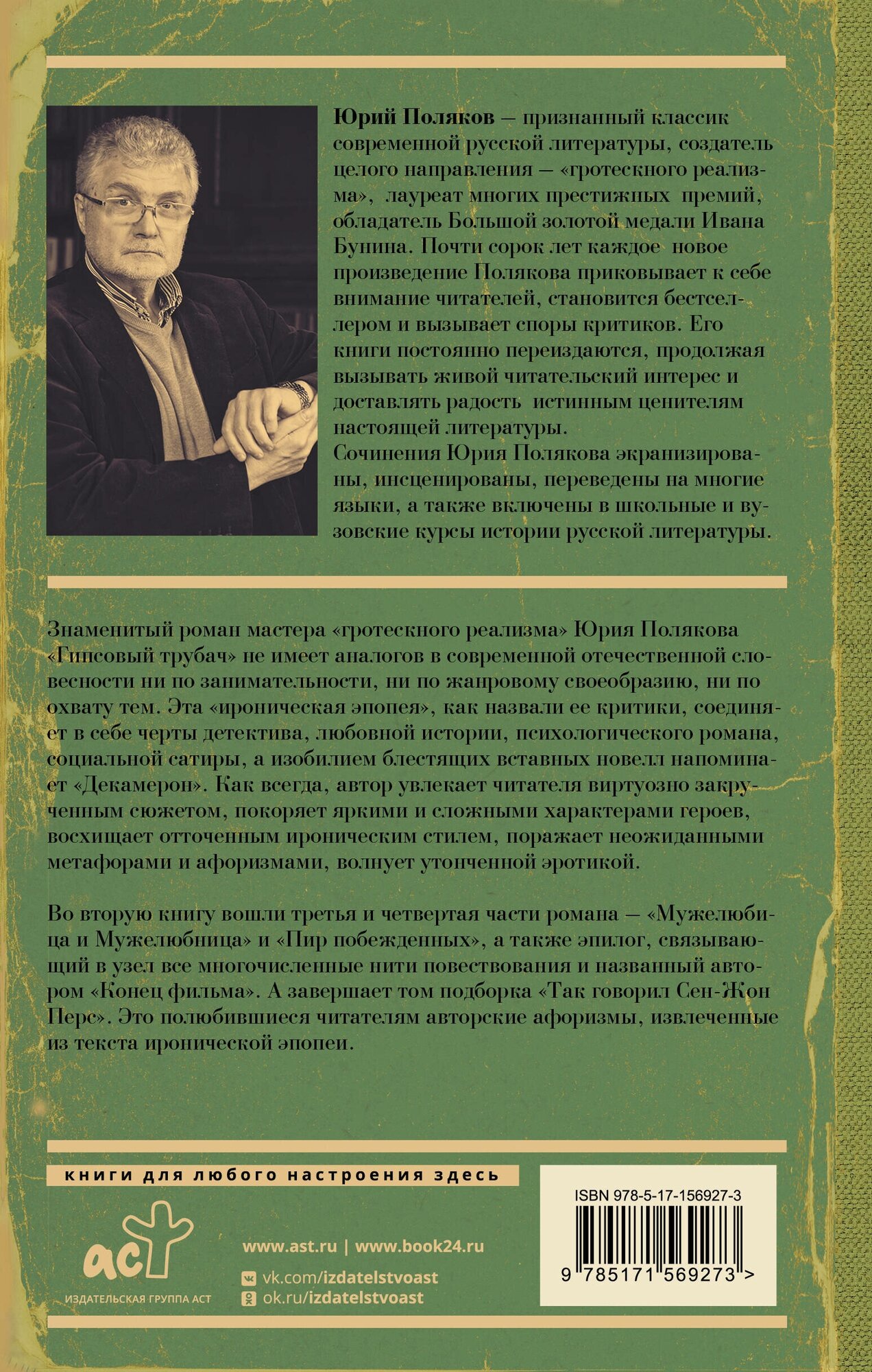 Знаменитый роман мастера "гротескного реализма" Юрия Полякова "Гипсовый трубач" не имеет аналогов в современной отечественной словесности ни по занимательности, ни по жанровому своеобразию, ни по охвату тем. Эта "ироническая эпопея", как назвали ее критики, соединяет в себе черты детектива, любовной истории, психологического романа, социальной сатиры, а изобилием блестящих вставных новелл напоминает "Декамерон". Как всегда, автор увлекает читателя виртуозно закрученным сюжетом, покоряет яркими и сложными характерами героев, восхищает отточенным ироническим стилем, поражает неожиданными метафорами и афоризмами, волнует утонченной эротикой.