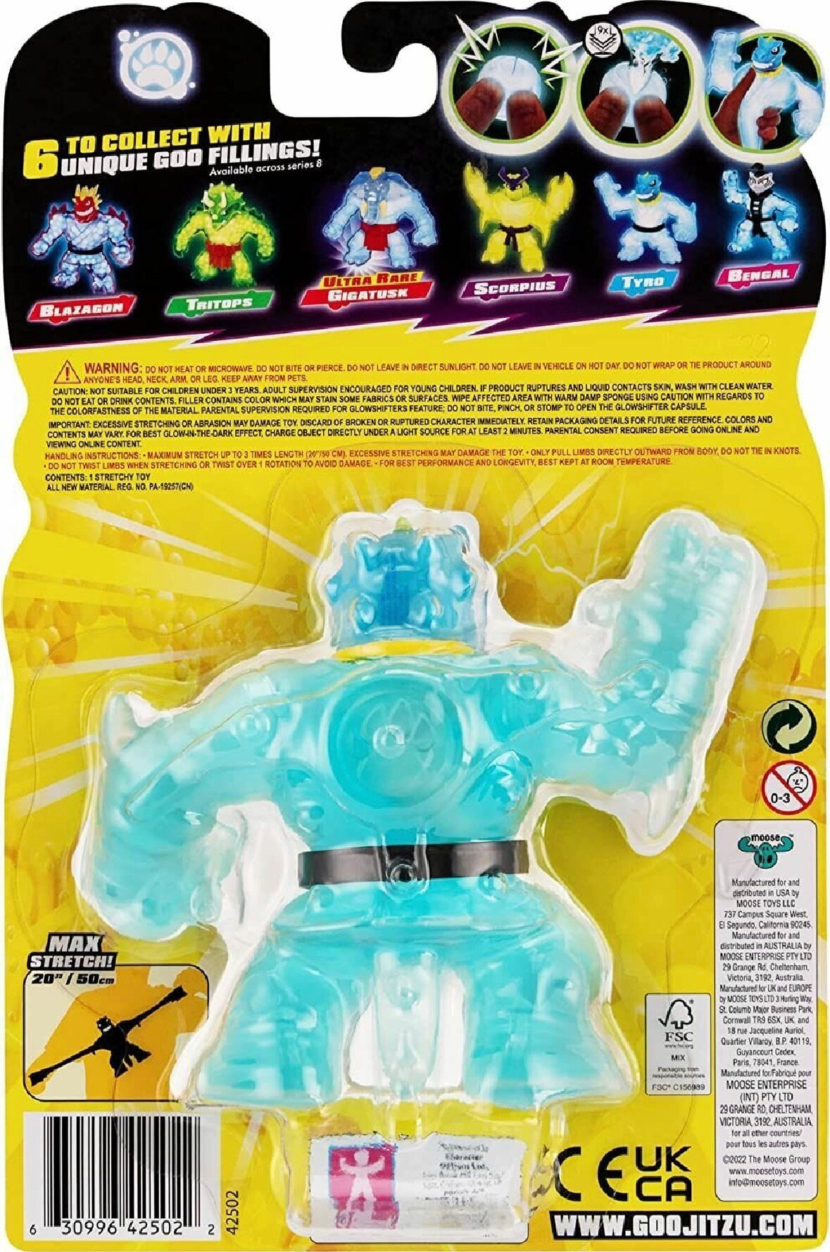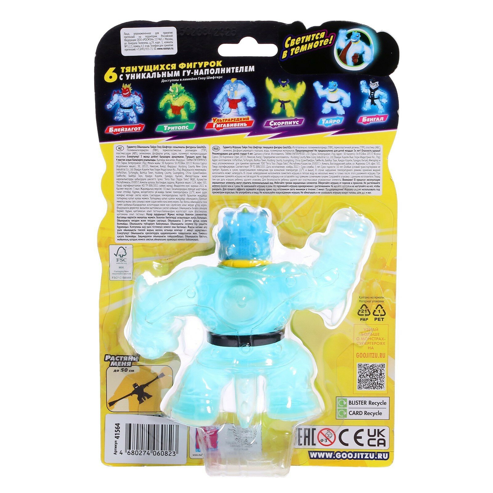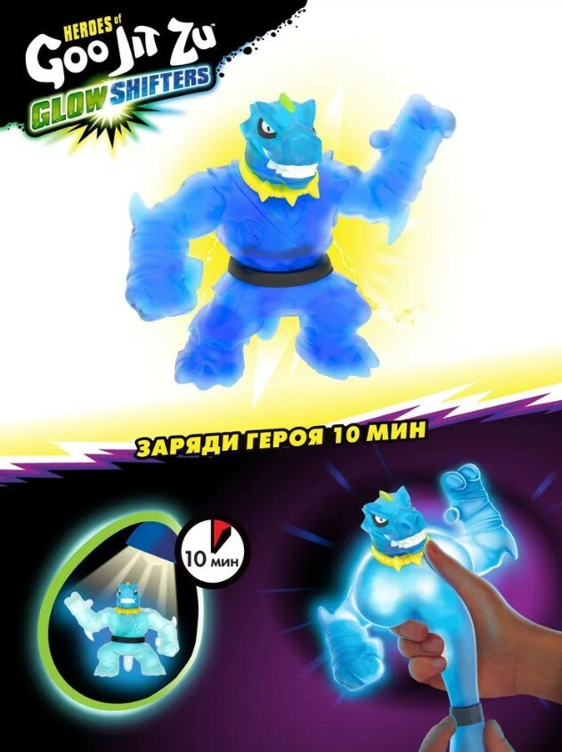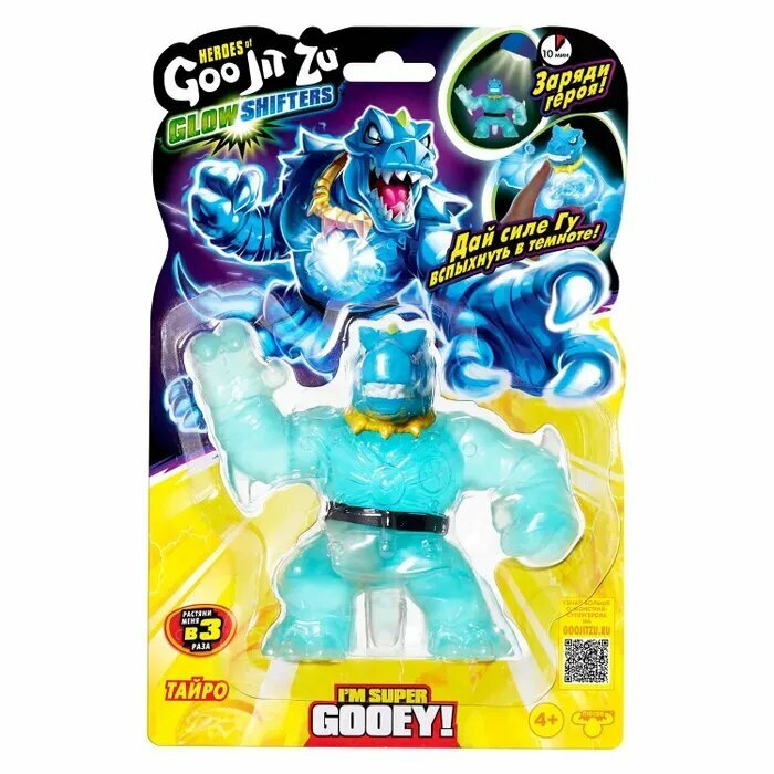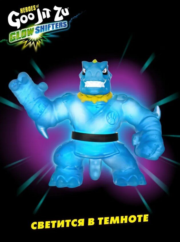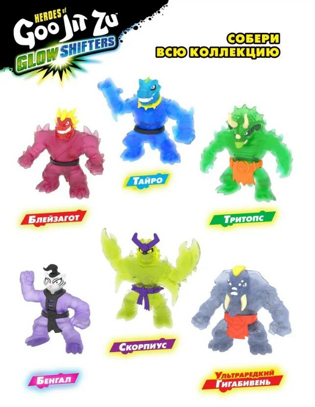 В новой линейке Гуджитсу Глоу Шифтрес монстры-герои устроят новую эпичную битву в кромешной тьме. Зарядите героя под лампой, чтобы сила Гу-вспыхнула. Если выключить свет, Тайро будет светиться в темноте. Теперь ему любая тьма нипочем! В серии Гуджитсу Глоу Шифтерс есть и другие персонажи: Блейзагот, Тритопс, Бенгал, Скорпиус и ультраредкий Гигабивень с особой силой Гу - Водная Атака.