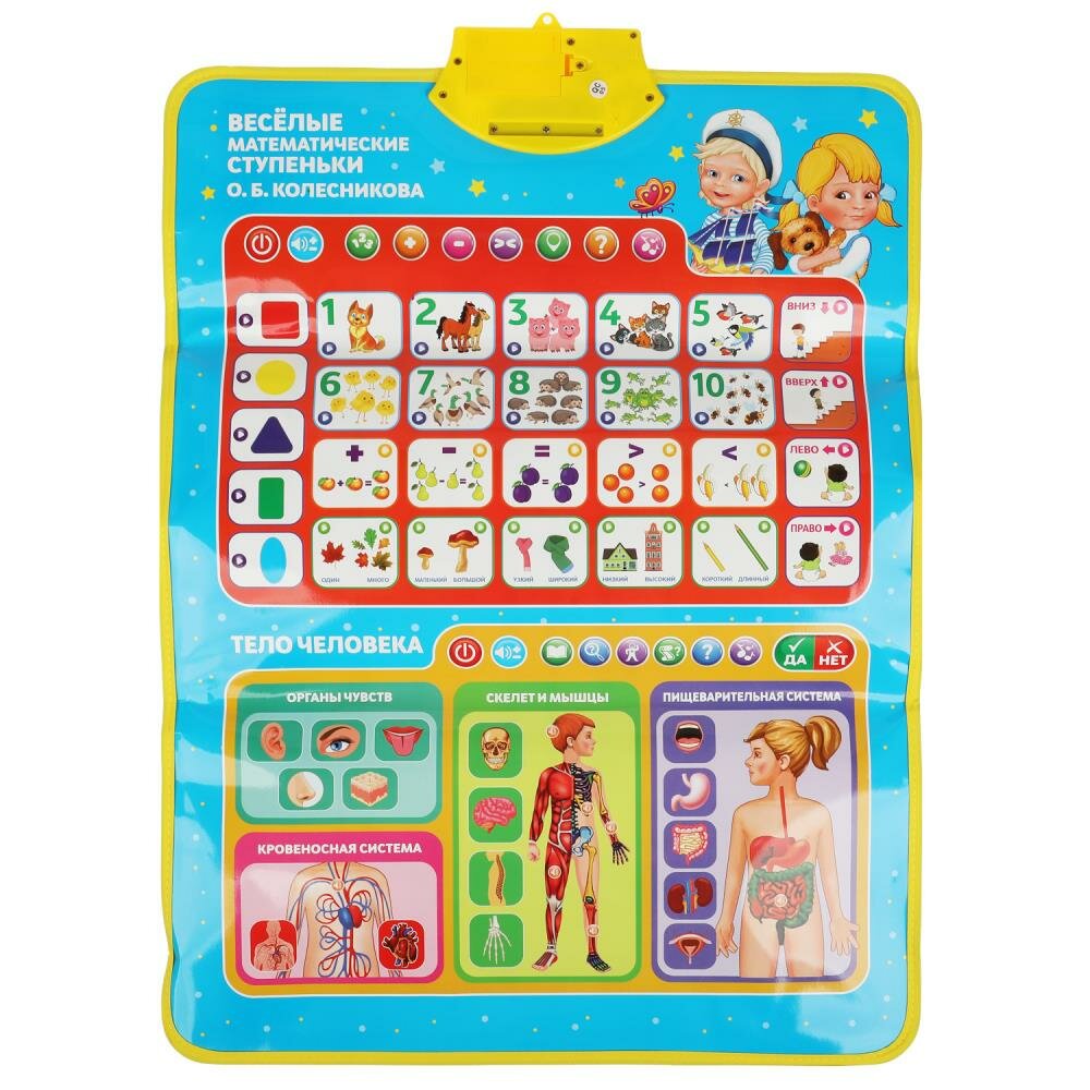 С помощью плаката ребёнок познакомится с буквами и словами русского и английского алфавита и основами математики. При переключении режима воспроизводятся слова на определённую букву, стихи и песенки. Малыш легко научится управляться с плакатом самостоятельно. Обучение превратится в интересную игру.