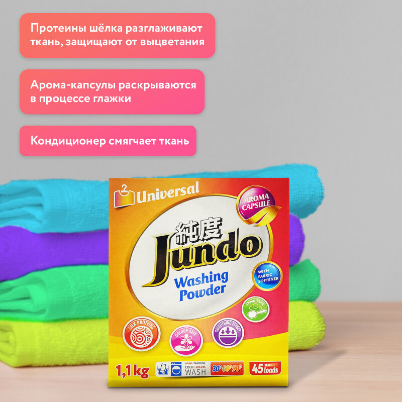 Универсальный порошок для стирки одежды и текстиля из всех типов тканей (хлопчатобумажных, синтетических, шерстяных и шёлковых). Протеины шёлка обволакивают и разглаживают ткань, защищают от выцветания, выгорания и различных загрязнений. Кондиционер в составе порошка смягчает ткань, предотвращает появление катышков, обеспечивает антистатический эффект, уменьшает образование заломов во время стирки.