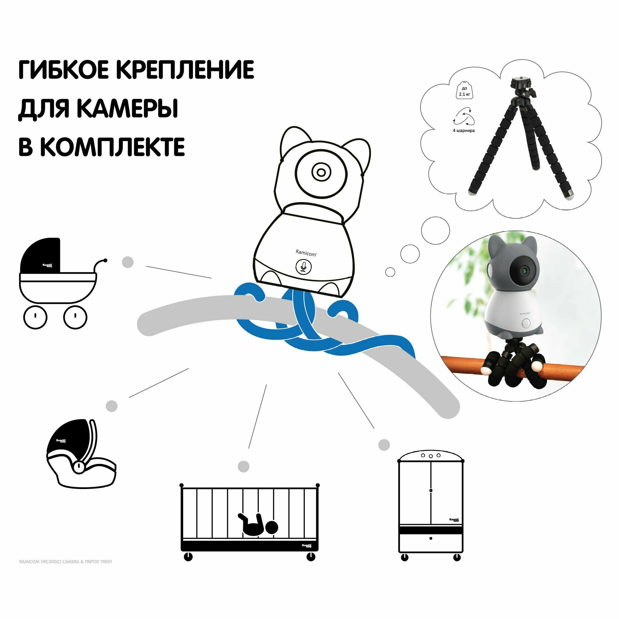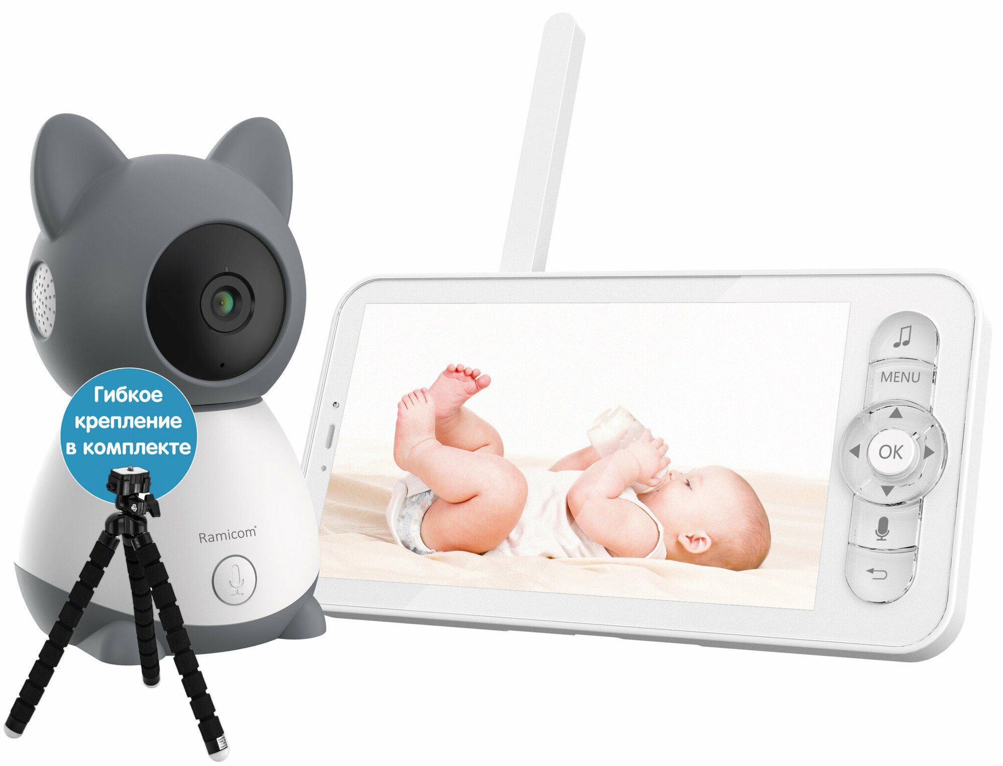 В комплект этой видеоняни уже добавлено гибкий штатив - тренога, с помощью которой камеру можно закрепить почти на любом предмете, например, на элементах мебели. Цифровая видеоняня Ramicom VRC300TR с большим экраном, диагональ которого составляет 12.7 см (пять дюймов) и поворотной камерой, управлять которой можно удаленно. В видеоняне собраны все важные функции, включая датчик движения и возможность подключения к смартфону или планшету для мониторинга из любой точки мира.