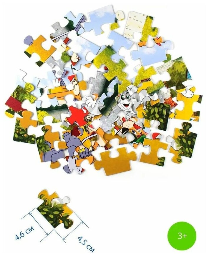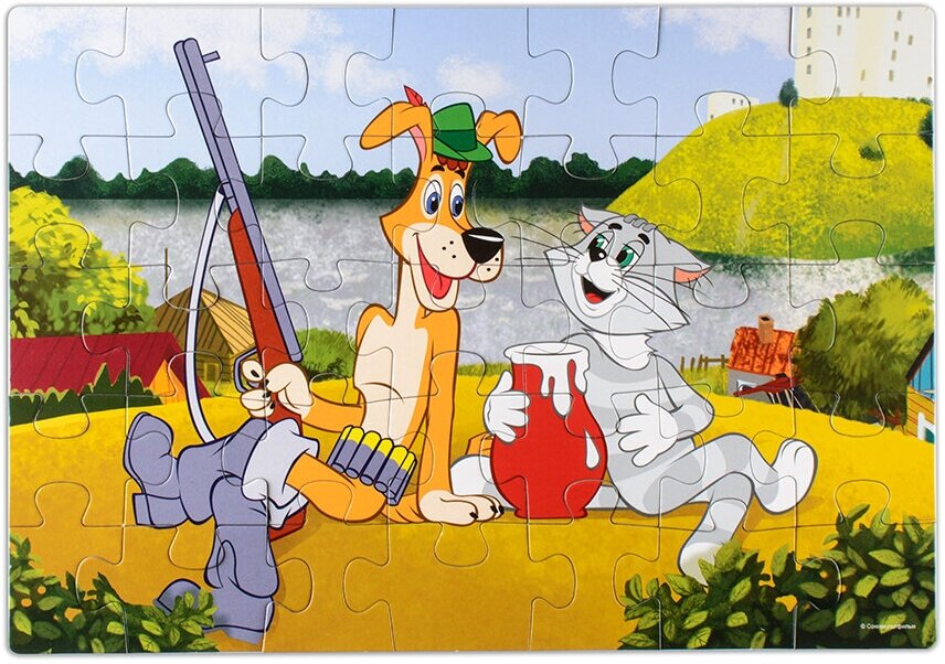 Пазл «Простоквашино» состоит из 35 крупных деталей. Его картинка дублирует известную сцену из мультфильма: ту самую, где Шарик фотоохотой занимается.