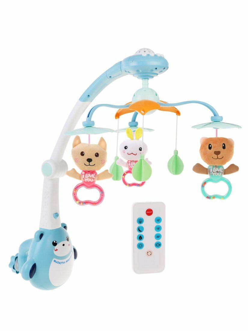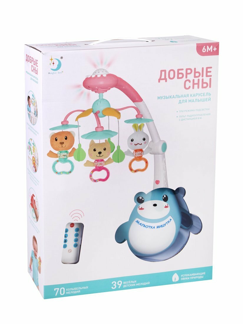 Основанием мобиля служит забавный Малютка-Мишутка, а на кронштейне расположены 3 милые игрушки-погремушки. Мобиль проигрывает 70 колыбельных мелодий, 39 весёлых детских мелодий и успокаивающие звуки природы. Можно установить таймер автоматического отключения (на 10, 15 или 20 минут). Элементы питания: 4 батарейки типа АА на 1.5 V (не входят в комплект), 1 батарейка типа CR2025 (входит в комплект).