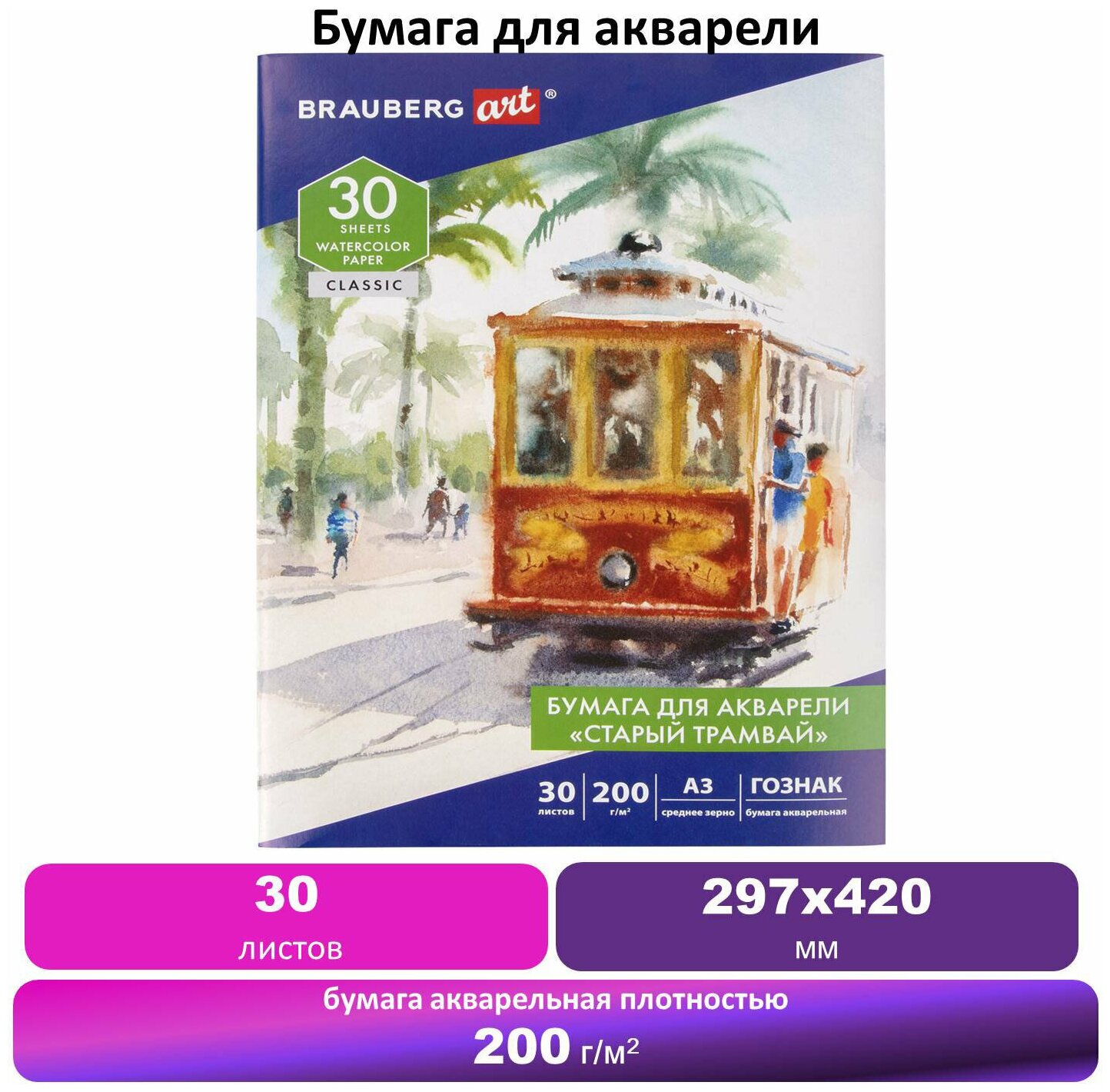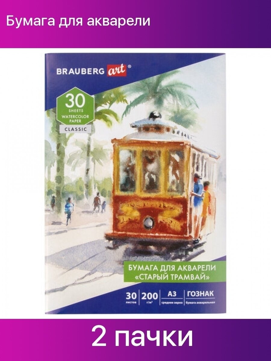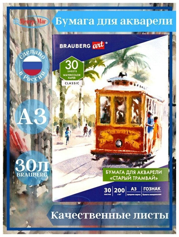 Бумага для акварели 30 листов А3 200г/м² твердая обложка - BRAUBERG ART BRAUBERG CLASSIC (4606224289328) Бумага для акварели А3 Art Classic Старый трамвай 30 листов 112324