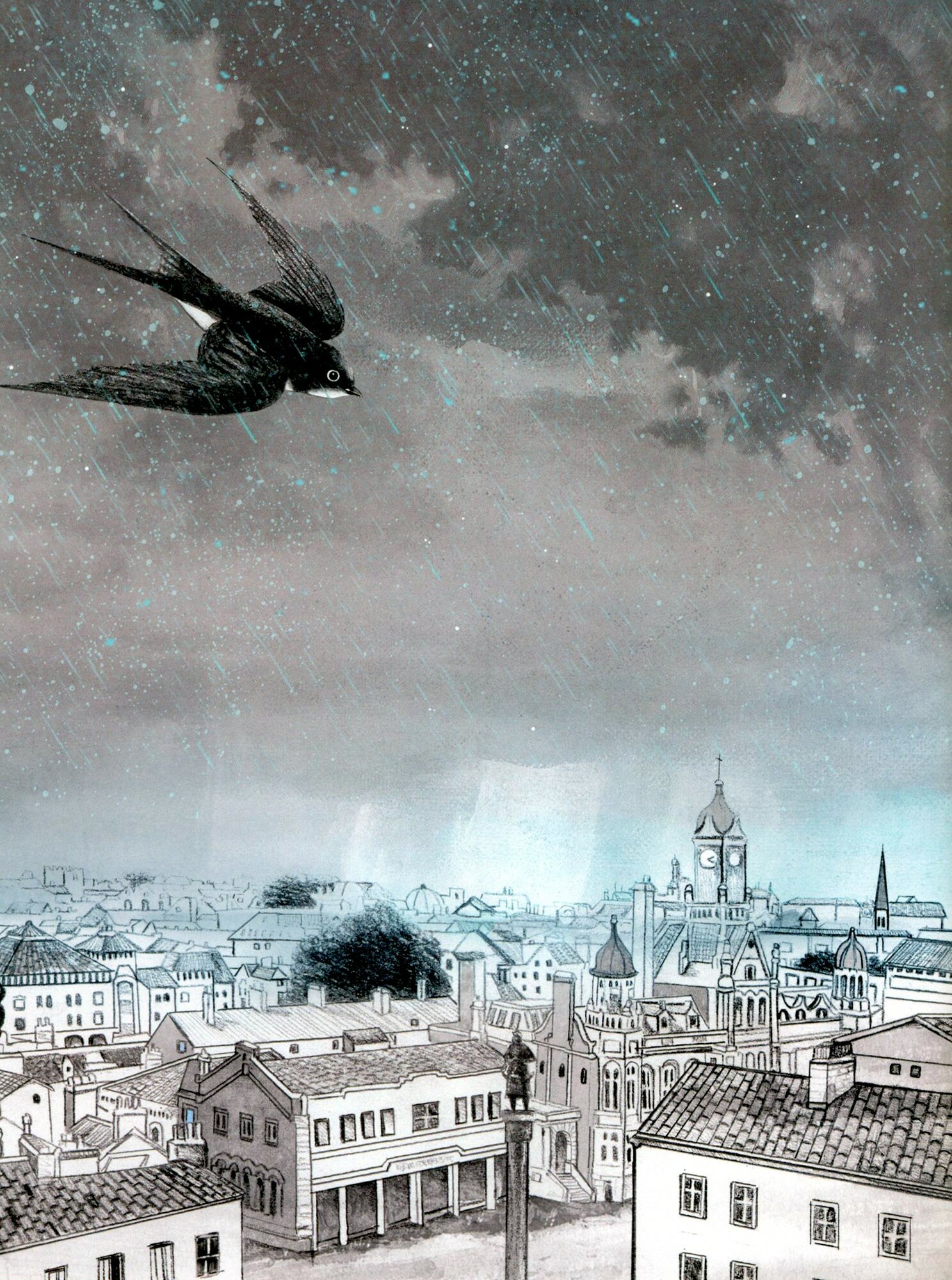 В «Счастливом принце» речь о прекрасной статуе из драгоценных камений, которая, находясь на самом верху, ежедневно и еженочно окидывает взглядом мир под ногами, видя всю несправедливость – нищету, болезни, голод. Свинцовое сердце не может вынести это и просит подругу-ласточку раз за разом относить самоцветы из одежды иль глаз самым достойным, превращаясь из сияющей статуи в невзрачное изваяние.