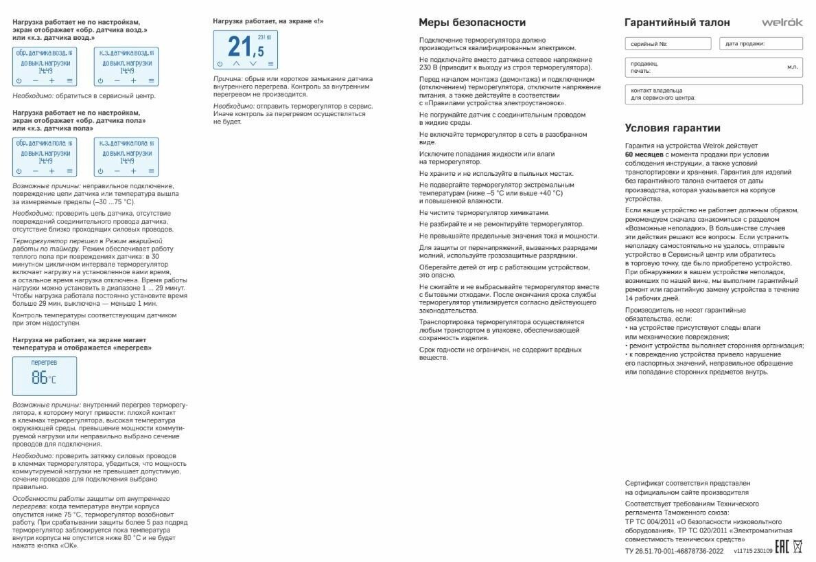 Термостат Welrok имеет 3 режима обогрева: «Воздух», «Пол» и «Воздух с ограничением по полу». Для чувствительных к перегреву паркетных или ламинатных полов подходит обогрев воздуха с ограничением по полу. Так комфортная температура воздуха будет поддерживаться не допуская перегрева пола.